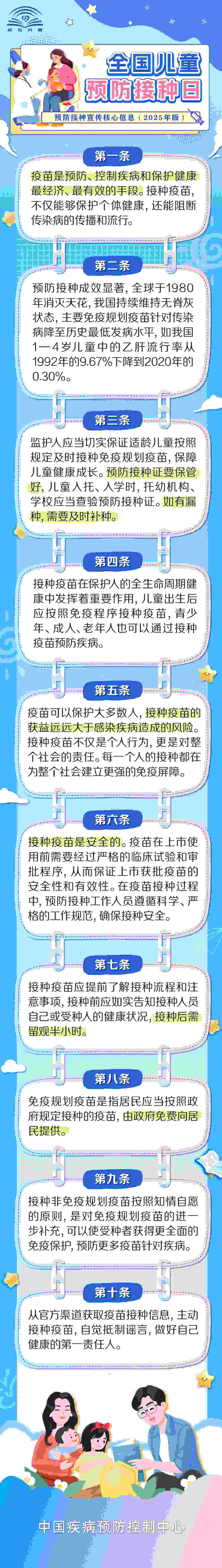疫苗是预防、控制疾病和保护健康最经济、最有效的手段,从我们出生起,就陪伴我们一生。婴幼儿期到学龄前期这段时间内,是孩子接种疫苗最密集的阶段,家长应该了解、注意哪些疫苗接种的重要事项?国家疾控局发布了《全国儿童预防接种日预防接种宣传核心信息(2025年版)》,家长们赶快转发、收藏吧~