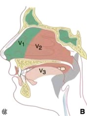 三叉神经是第Ⅴ对颅神经,为混合神经,含有感觉纤维(一般躯体传入纤维)和运动纤维(特殊内脏传出纤维)。其中,感觉纤维占大部分,胞体位于三叉神经节内,其周围突形成三叉神经的3个分支:眼神经、上颌神经与下颌神经,分别经眶上裂、圆孔与卵圆孔出颅腔。