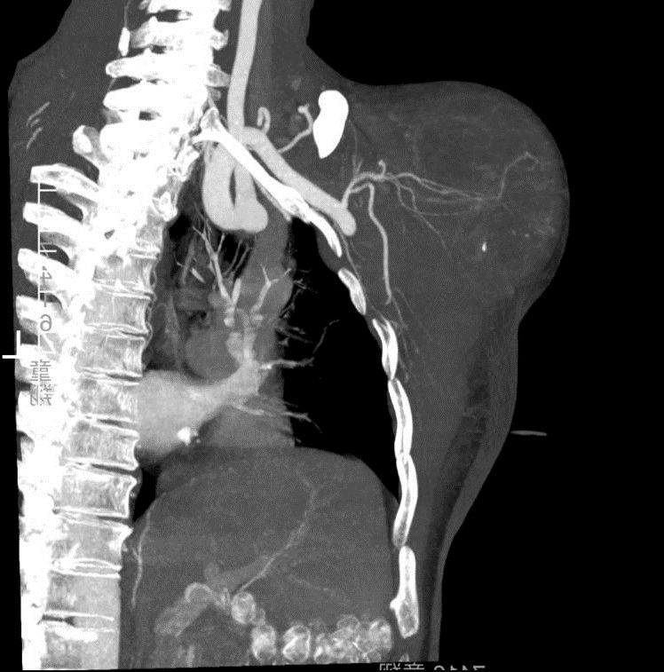 放射科刘主任带领放射科团队凭借丰富的经验,为王哥尽可能拍到了部分清晰的磁共振影像,为精准制定手术方案奠定了基础。随后,骨科、血管外科、放射科专家团队联合为王哥进行了手术。先堵住那些给肿瘤“输血”的血管,降低术中大出血风险;在肿瘤包裹的最主要动脉血管里植入支架,放置阻断球囊,防止发生大出血,对右手臂的主要动脉进行保护;再剥离、完整切除这个排球大小的肿瘤。 由于肿瘤侵犯了肩关节囊的所有肌肉肩袖组织,王主任将肱骨连同周围的肿瘤组织完整切除,然后用反肩人工假体对王哥的肩关节进行了重建。同时手术室、麻醉科、输血科也对手术的安全顺利完成进行了全力保障。
