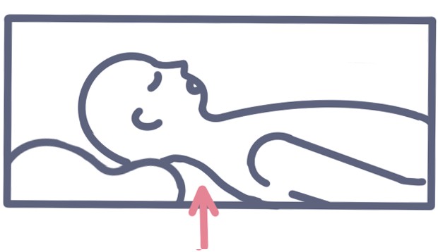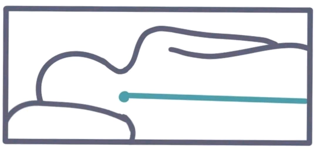 侧卧位时枕头同样要置于头和脖子下面,侧卧位枕头高度约为自己一侧颈根部到肩峰距离,保证枕头能很好地填充耳朵到肩膀之间的空隙,维持头颈部在侧卧时位于身体中轴线上。使颈部与头部保持平直,颈椎和脊柱处于放松状态。