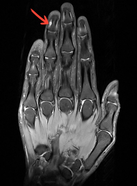 局部变色:甲床下可能出现蓝红色的小斑点(有时可通过在暗室下光照指腹自行自检)。如果你的手指或脚趾经常莫名其妙地疼痛,尤其是天气变冷时更加严重,千万别忽视,这可能是甲下血管球瘤的信号!可到医院做个手指/脚趾的MRI明确诊断。手指磁共振(MRI)检查
