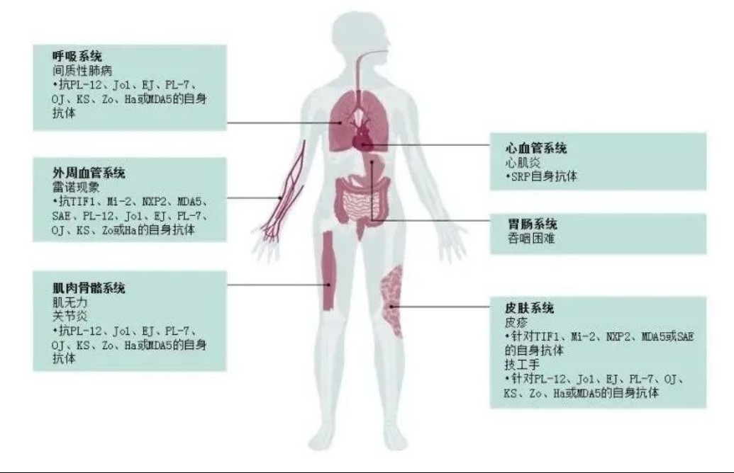 肌肉外表现相对其余类型肌炎少见,可出现间质性肺病、心脏受累、关节炎、皮疹和雷诺现象等。