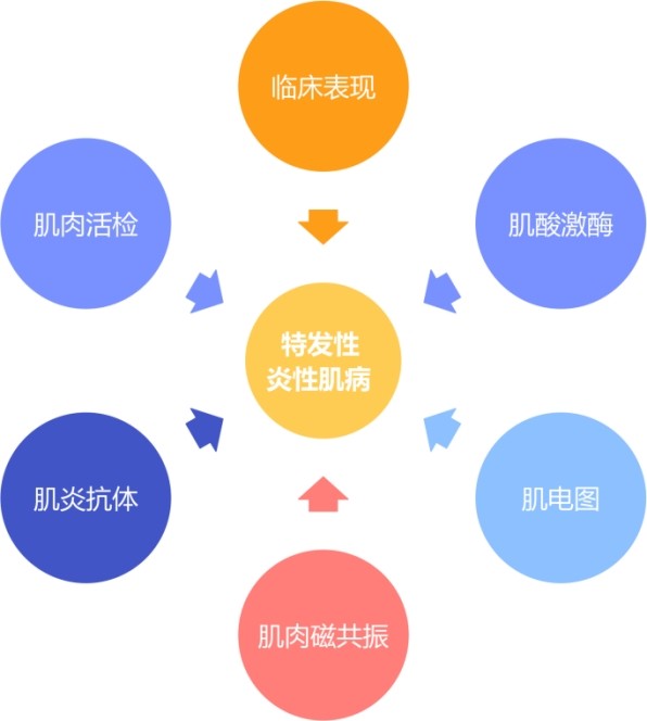 目前特发性炎性肌病的诊断主要基于临床症状和辅助检查的组合,包括肌电图、MRI模式、血清学抗体和血清肌酶水平,必要时需行肌肉活检来明确诊断。