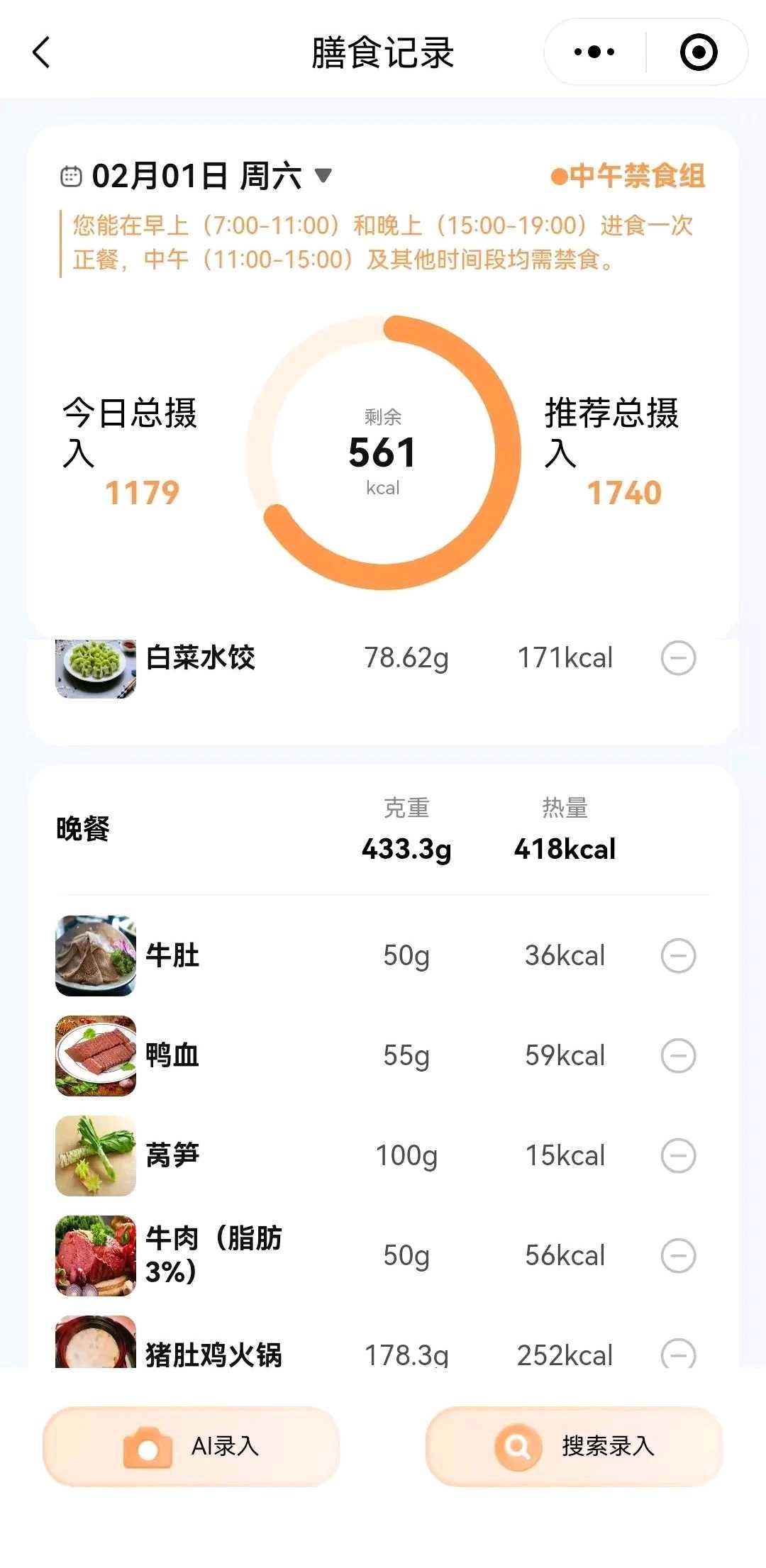 我有了“健康小秘”和“健康管家”除了不吃午餐,我还需要在微信小程序上打卡,记录自己的饮食、运动、体重等数据,拍照上传早餐和晚餐的情况。最初,我觉得这是个“工作”负担,不知道自己能否坚持,但是没多久我就被这个小程序“圈粉”了。一盘菜的照片传上去,写上大概吃了多少,它就能自动识别出我摄入了多少热量、包括哪些营养成分,非常方便有趣,简直是我的贴身“健康小秘”。