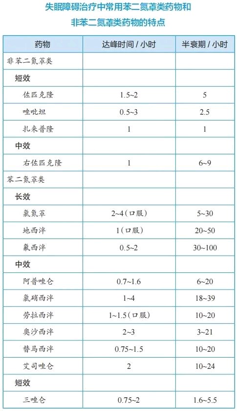 目前国内临床上最常被用来治疗失眠的药物为苯二氮䓬类药物和非苯二氮䓬类药物。根据半衰期的长短,可分为短效(<8小时)、长效(>24小时)和介于两者之间的中效