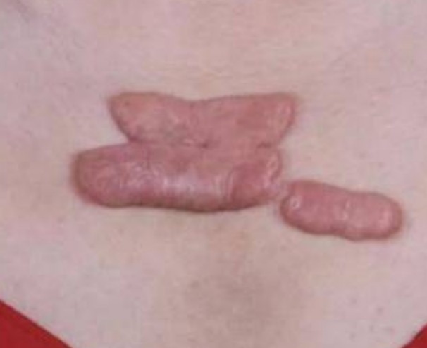瘢痕疙瘩:分为继发性及原发性。除增生性瘢痕的特点外,会超边界生长,向周围组织浸润。蟹足状或蜈蚣状,可呈粉色、深紫色、暗红色,具有进展性。常发于痤疮、手术、外伤、烧烫伤、瘢痕体质。