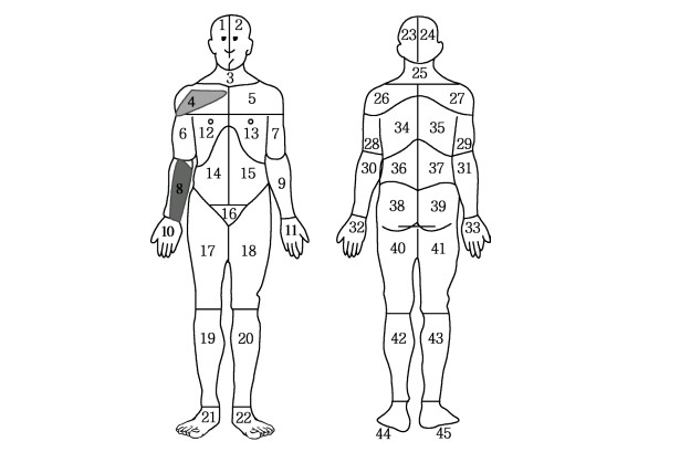 2.疼痛部位评估 疼痛根据部位可分为内脏器官疼痛和体表区域疼痛。体表疼痛可以使用疼痛的体表面积评分法进行评分。将人体表面分成45个区域,身体的前面分为22个区,后面分为23个区。患者将自己疼痛的部位在相应的区域图上标出,无论大小,一个区域均记1分。总评分反映疼痛区域的数目,可计算疼痛占体表面积百分比。另外,可通过涂抹颜色不同表达疼痛强度。用无色代表无痛,涂抹黄色代表轻度疼痛,红色代表中度疼痛,黑色代表重度疼痛。此评分法可以帮助医生评估疼痛的性质、来源、面积、强度等,不适用于老年人和头痛患者。