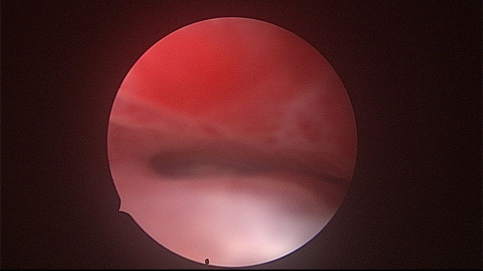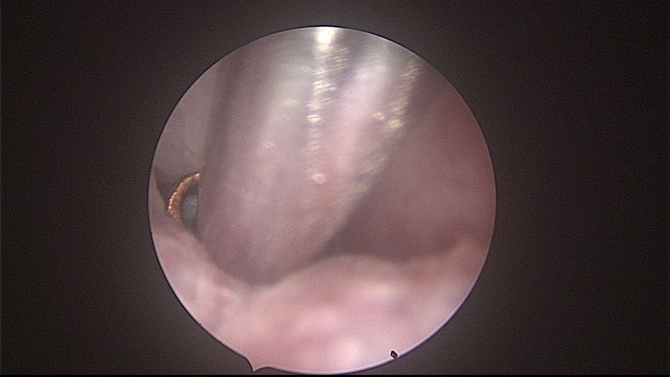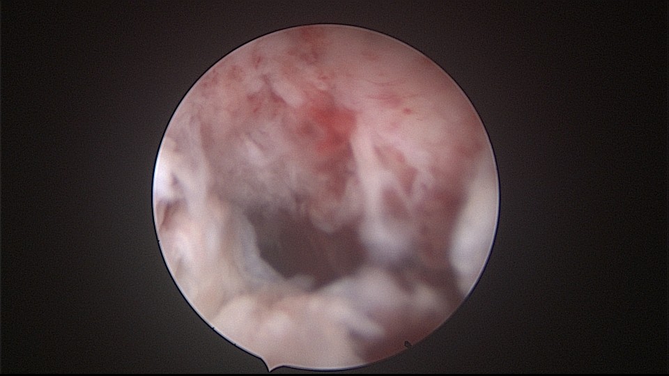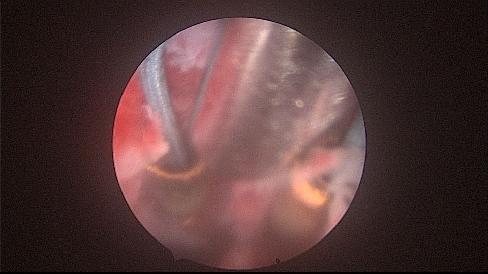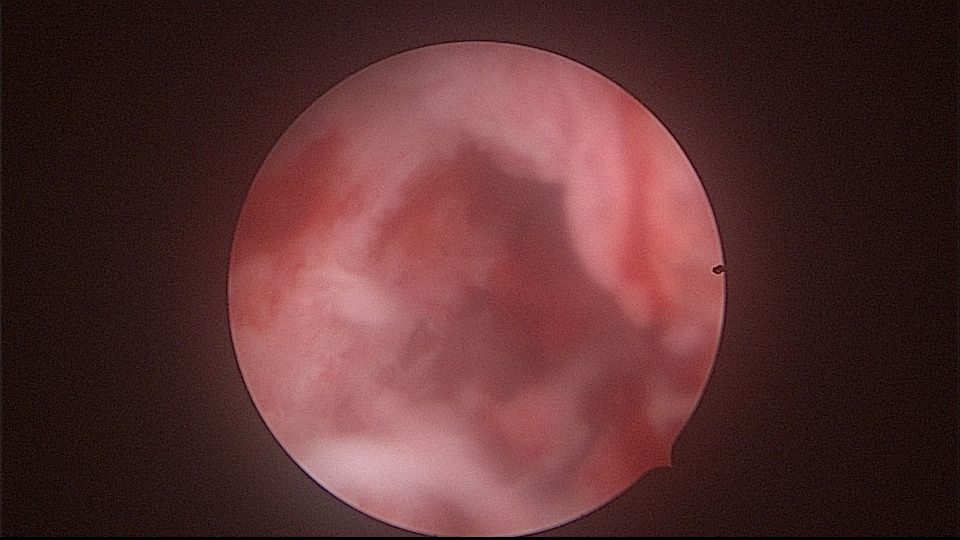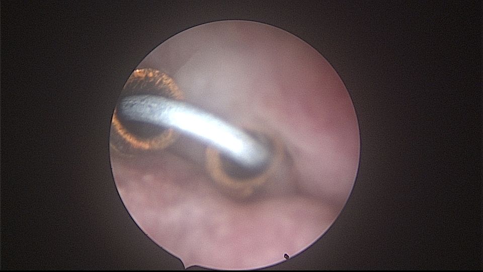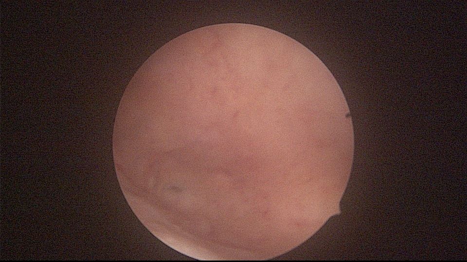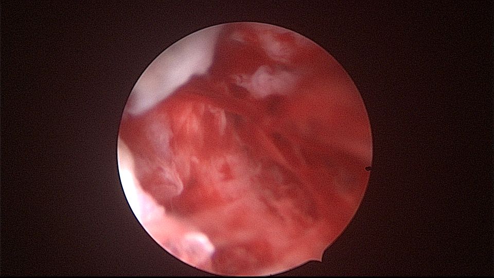 患者52岁,G2P1,顺产1次。安环27年,外院取环失败。病人肥胖,B超提示子宫前位,节育环距宫底0.9cm。子宫极度前倾前屈位,宫腔镜见宫颈管组织杂乱,宫颈管上段右前壁见假道,膨宫不良,视野模糊,寻找宫腔方向困难,准备B超监护过程中,拆走扩阴器,腹部下压子宫,终于寻找到了宫颈内口,看到了爱母环下端,异物钳牵拉出节育环,再次探查宫腔,无其他异常。