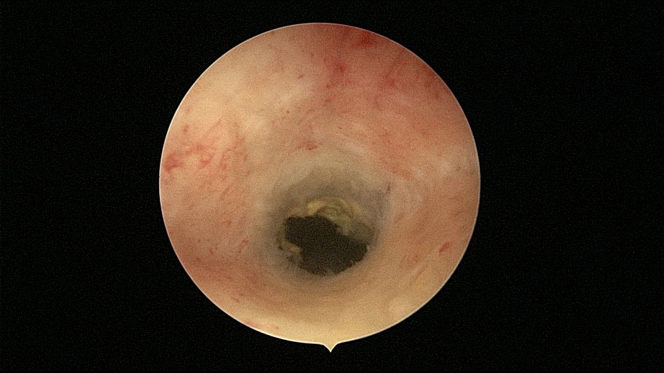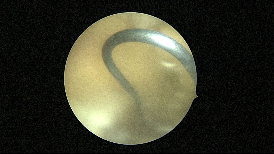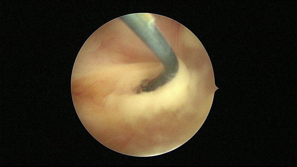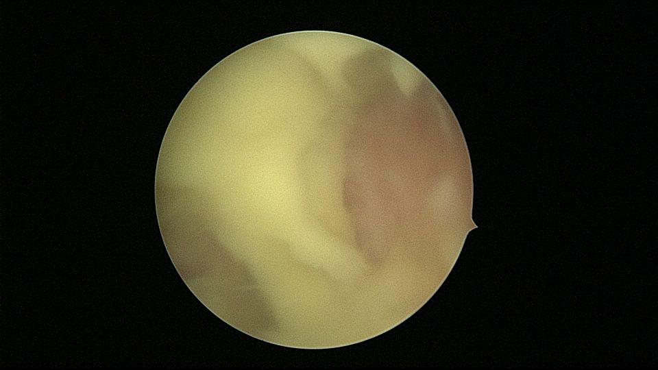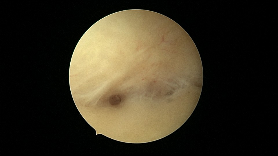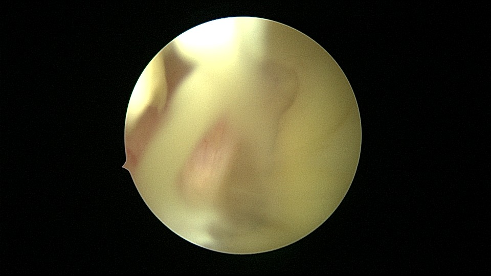 54岁,G2P1,顺产1次,安环16年,绝经10年,无不适症状,B超提示节育器嵌顿,宫腔积液2.3cm*1.9cm,血常规正常,白带常规乳酸杆菌少,其余指标正常。宫腔镜见宫颈管中上段封闭粘连,镜鞘分离粘连,见V型环一臂铜环全部嵌入右侧宫壁肌层内,取出节育器,宫腔内见灰白色脓液漂浮,膨宫液冲洗脓液,宫腔镜下无脓苔后结束手术,术后抗炎治疗。病检:宫腔少许宫内膜,呈慢性炎改变。