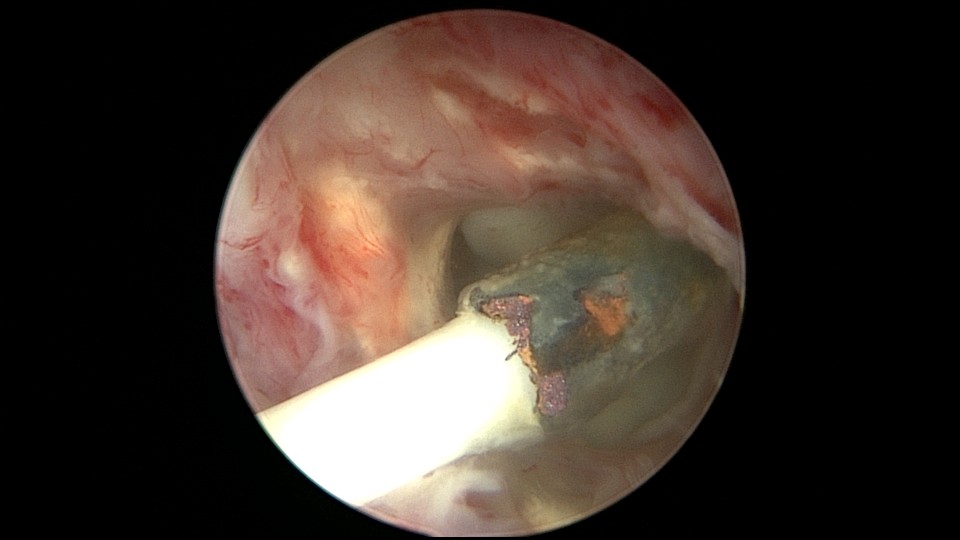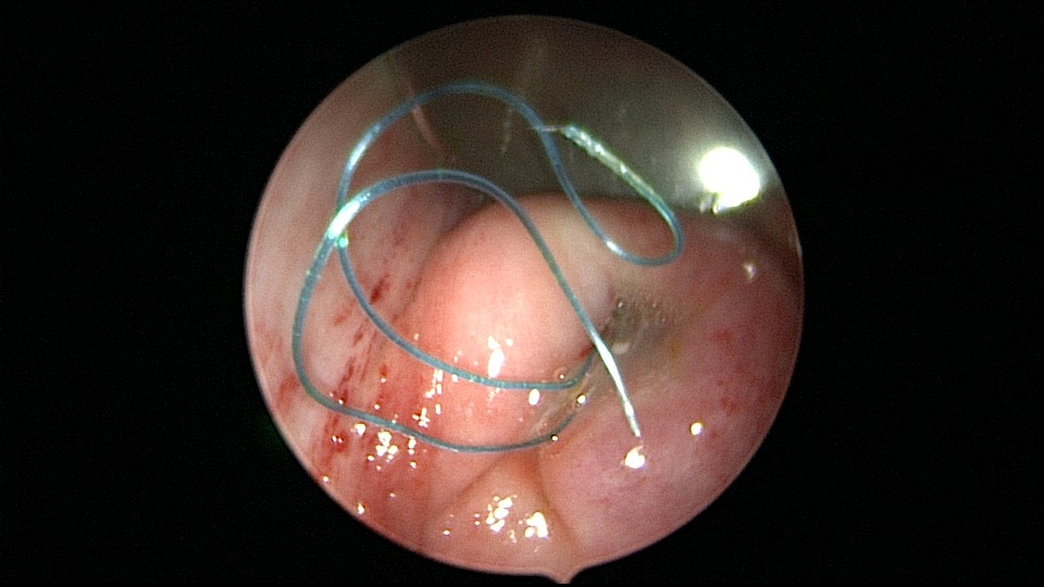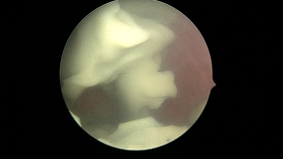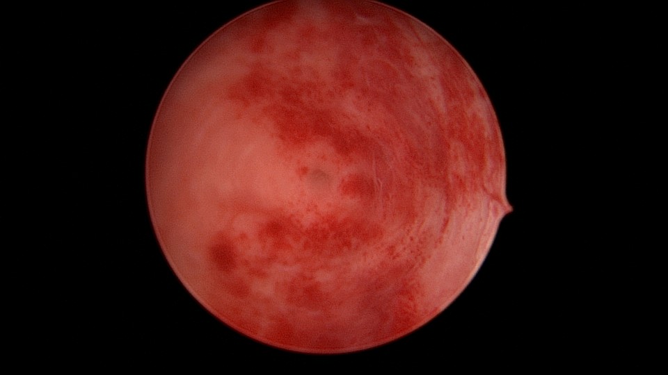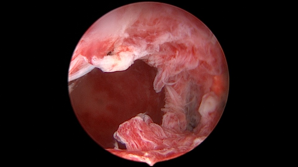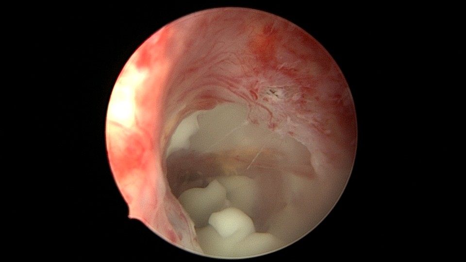 患者56岁,G3P1,顺产1次。安环20+年,绝经10年,下腹坠胀不适1周,B超提示子宫后位,宫内无回声区2.4cm×1.5cm。宫颈外口见节育环尾丝,环纵臂卡在宫颈管内,宫腔镜难以进入宫腔,取环后看到宫腔粘稠白色脓液,宫腔左侧前后壁粘连,膨宫液冲洗脓液,宫腔无其他异常。