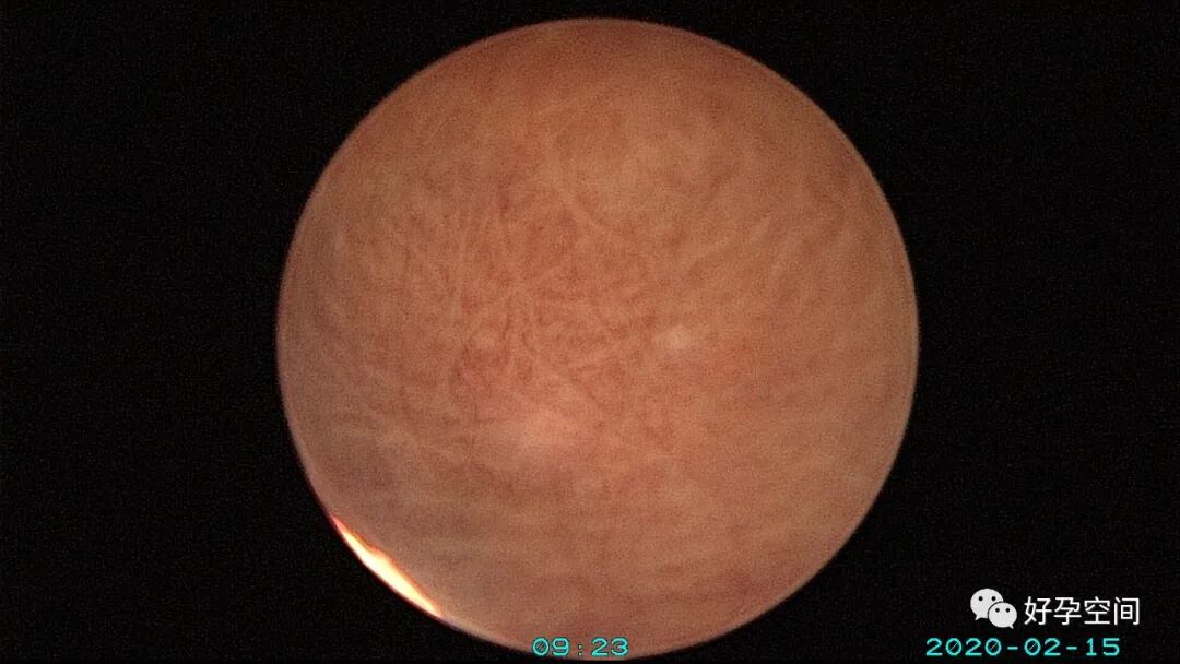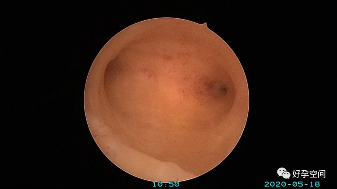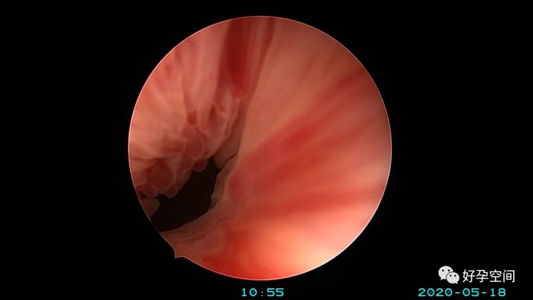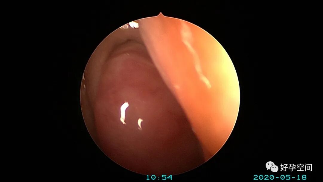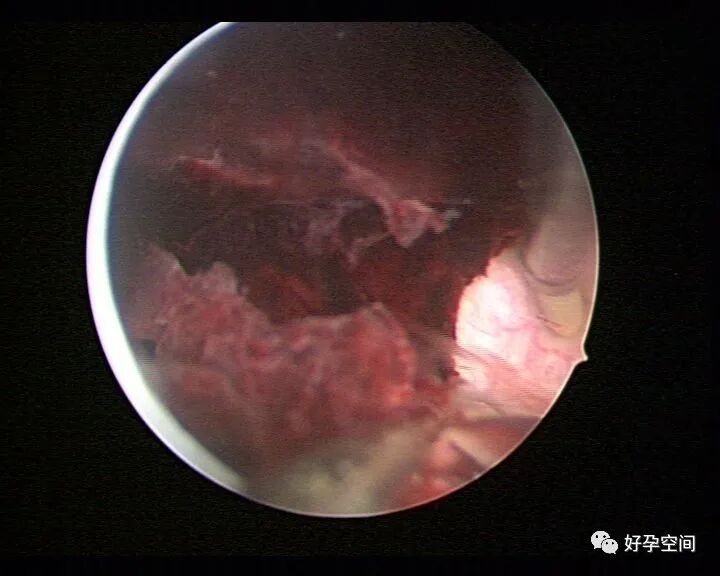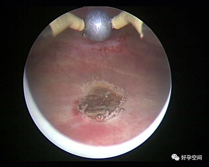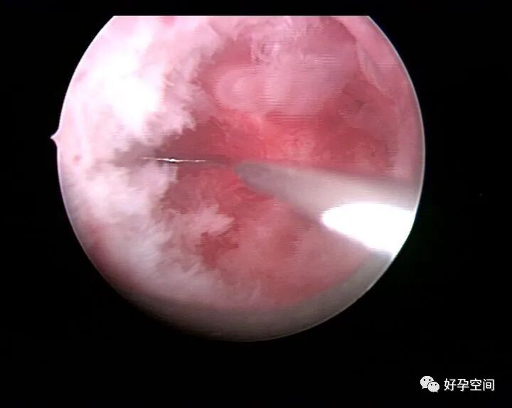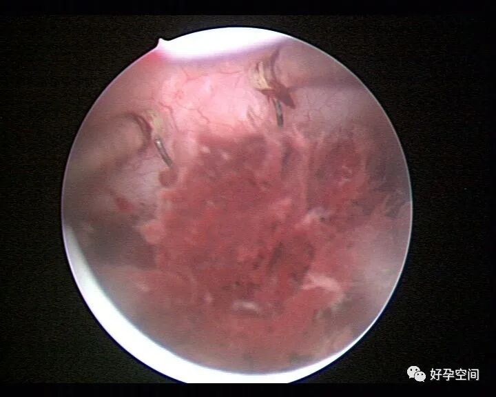 病例4:32岁,取卵13枚,取卵术后血尿膀胱内血块尿潴留,膀胱灌洗效果不佳,宫腔镜探查膀胱,清除血块,膀胱底见穿刺伤,电凝止血。