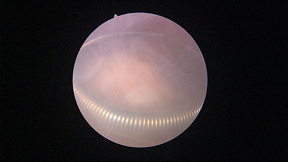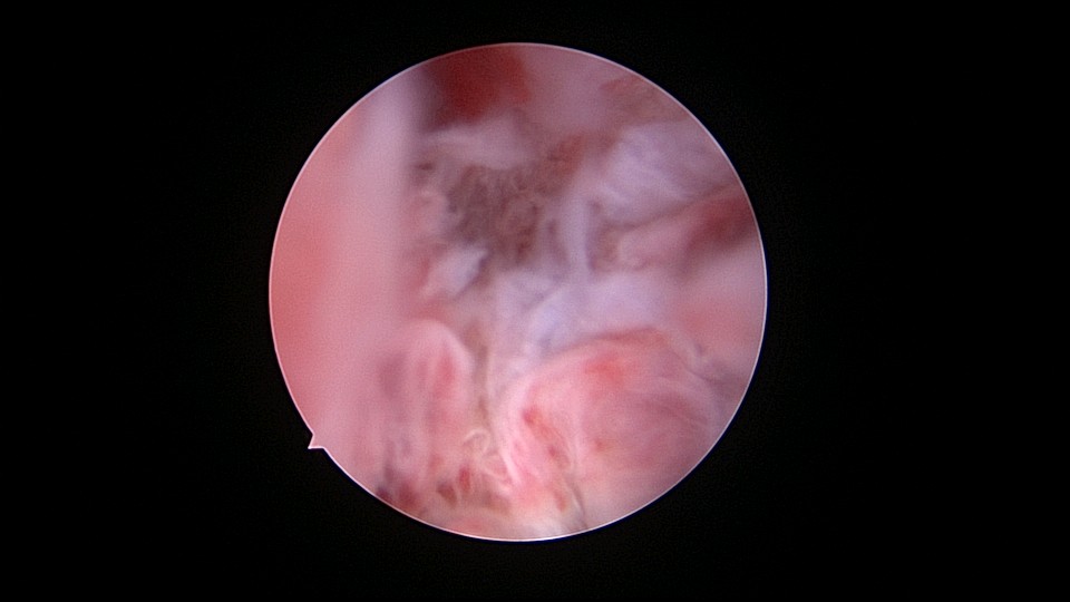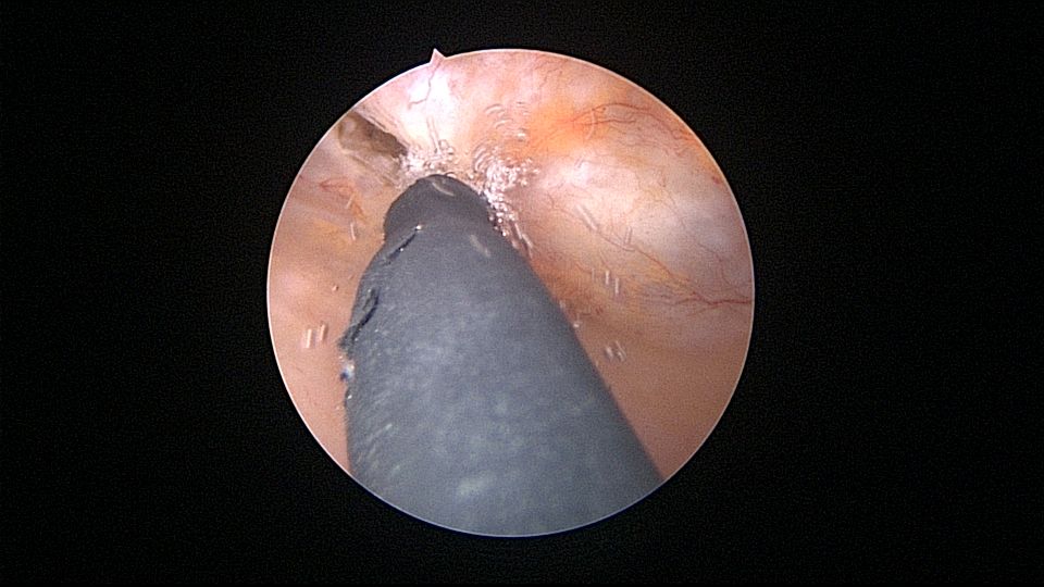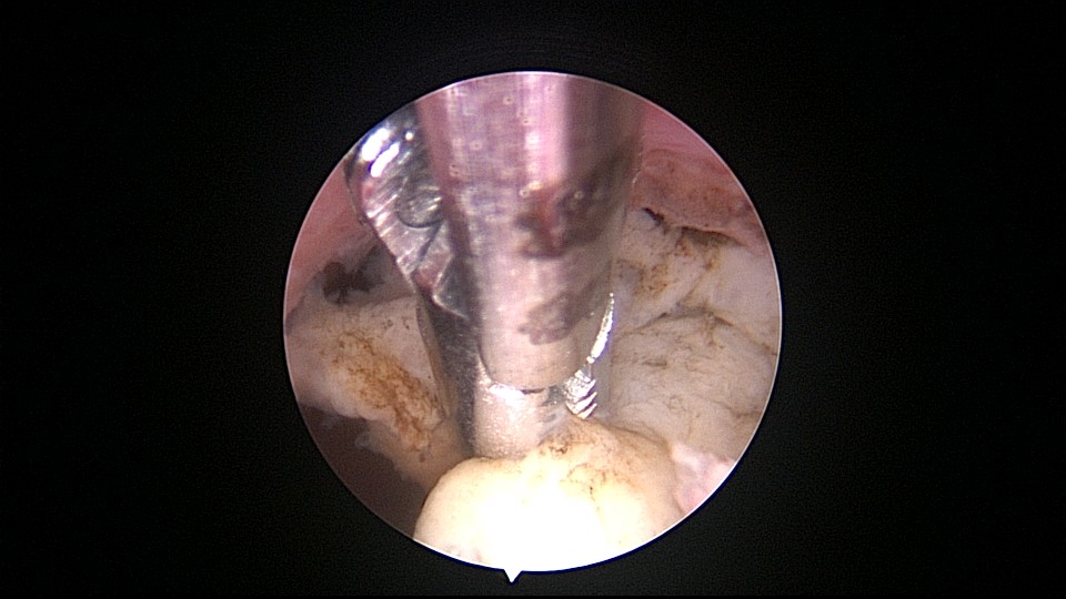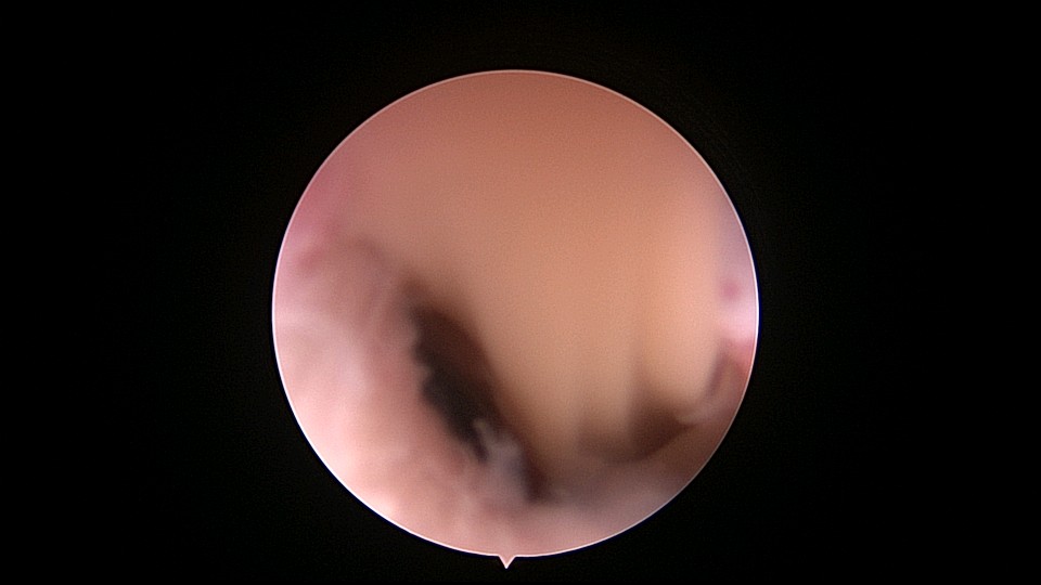 患者69岁,G2P1,顺产1次。产后曾安环1次,后自然脱落,再次安环距今40年,绝经20+年。外院取环失败(没有进入宫腔)。B超子宫后位,宫内O型环距宫底0.3cm,宫腔积液(按以往经验,考虑宫腔积脓),另见宫内稍强回声1.1cm*0.8cm。子宫极度后倾后屈位,宫颈管狭小坚硬,扩张困难,宫腔镜难以进入。宫腔镜直视下充盈膀胱,B超监护下异物钳指示宫腔方向,宫腔镜艰难进入宫腔,见灰白色脓液涌出,O型环位置正常,宫腔后壁占位包块位于节育环圈内,约1.5cm*1.5cm*1cm,异物钳顺利取出节育环。单极电针切除占位包块,但包块直径大于宫颈内口直径,异物钳多次尝试取出,均失败,不得已用单极电针切开宫颈内口左侧狭窄处,异物钳缓慢牵拉取出标本,膨宫液冲洗宫腔脓液,宫腔无其他异常。包块病检为内膜息肉。