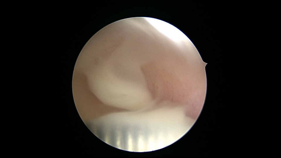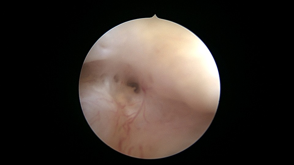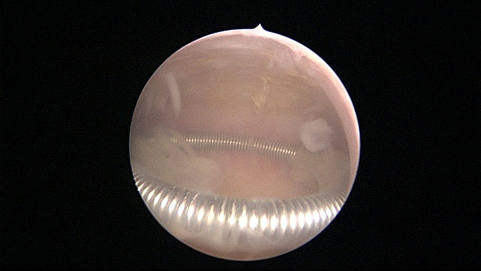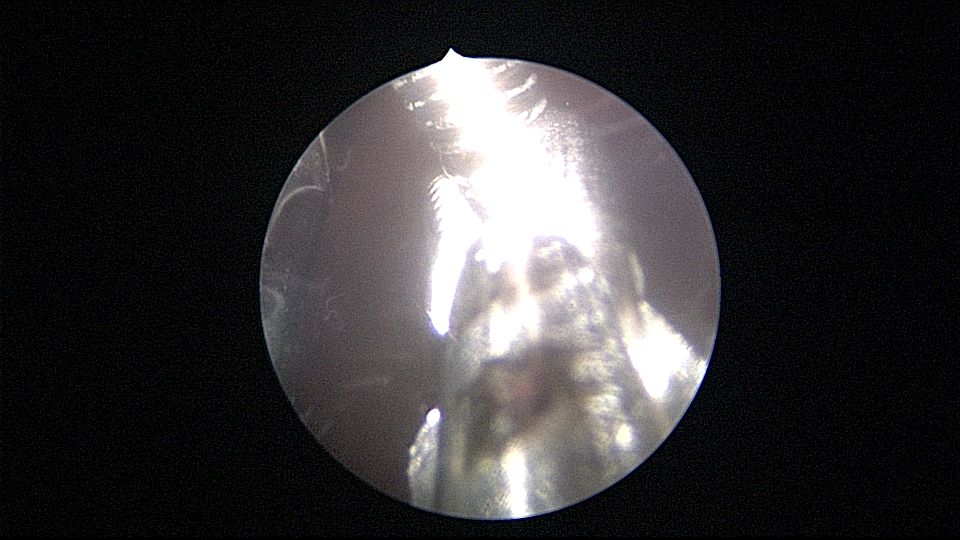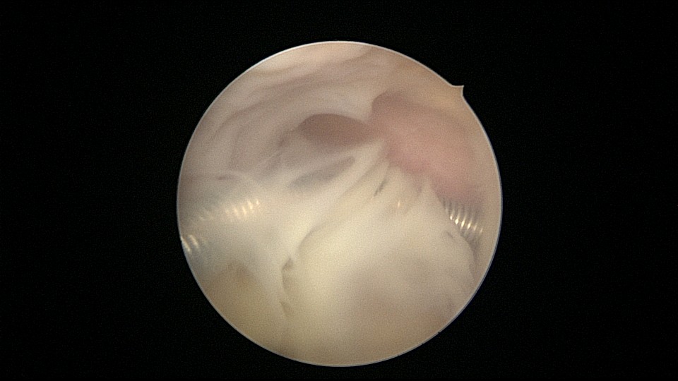 患者55岁,G5P1,顺产1次。安环20年,绝经8年。子宫后位,外阴、阴道及宫颈萎缩,宫深6.5cm,宫颈内口封闭粘连,镜鞘推开粘连,见灰白色脓液,O型环位置正常,异物钳顺利取出节育环,膨宫液冲洗脓液,宫腔无其他异常。