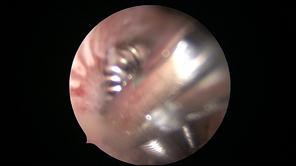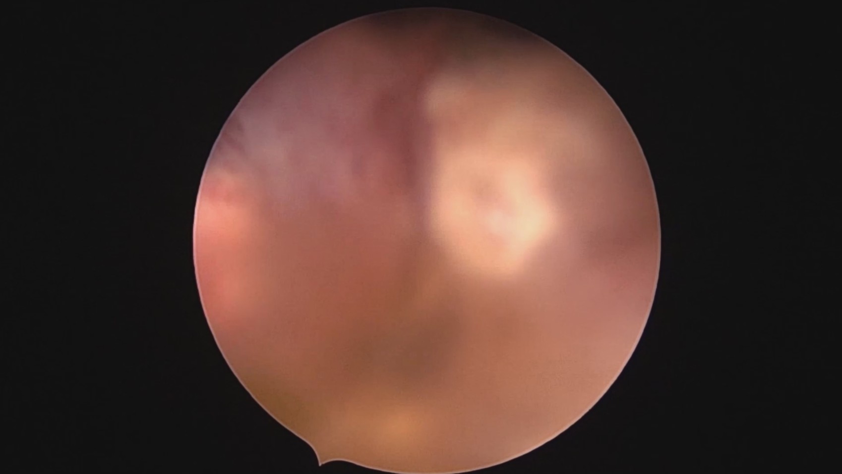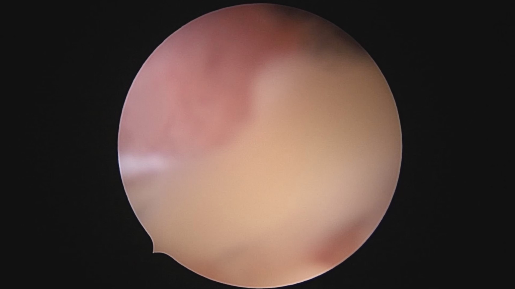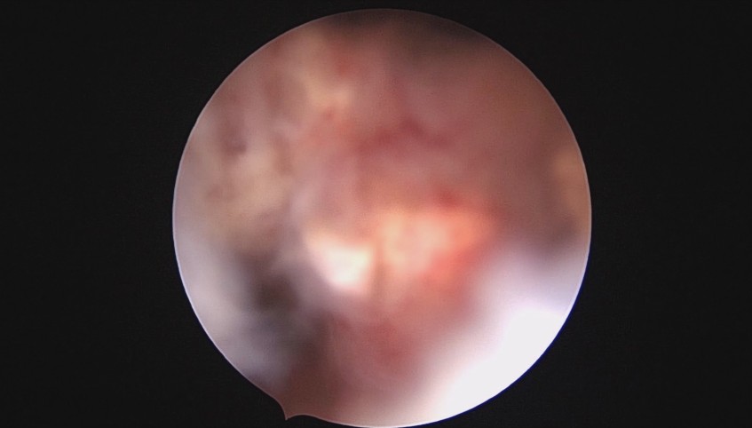 患者28岁,G7P3,顺产3次,完全纵膈子宫,单宫颈。2015年、2018年顺产,2019年左侧宫腔计划外妊娠行宫腔镜取胚及左侧宫腔放置γ环(推测既往妊娠左侧宫腔妊娠可能性大)。2023年4月带环受孕(应该为右侧宫腔妊娠),2023年12月足月阴道分娩,分娩时试图取出左侧宫腔内节育器,因操作困难,取环失败。2024年2月顺产后67天,要求取出宫内节育器,左手臂放置皮埋避孕棒。B超提示环距宫底1.1cm,环两翼分别距子宫前壁浆膜面0.4cm,距子宫后壁浆膜面0.3cm。宫腔镜术中膨宫困难,见宫颈管及宫腔少许淡黄色脓液流出,γ环逆时针旋转约80度,两臂指向左侧宫腔前后壁(2019年放置环时亦如此,因单侧宫腔前后径大于横径所致)。异物钳取出节育环,左右侧宫腔均见散在黄色机化组织,未取病检。