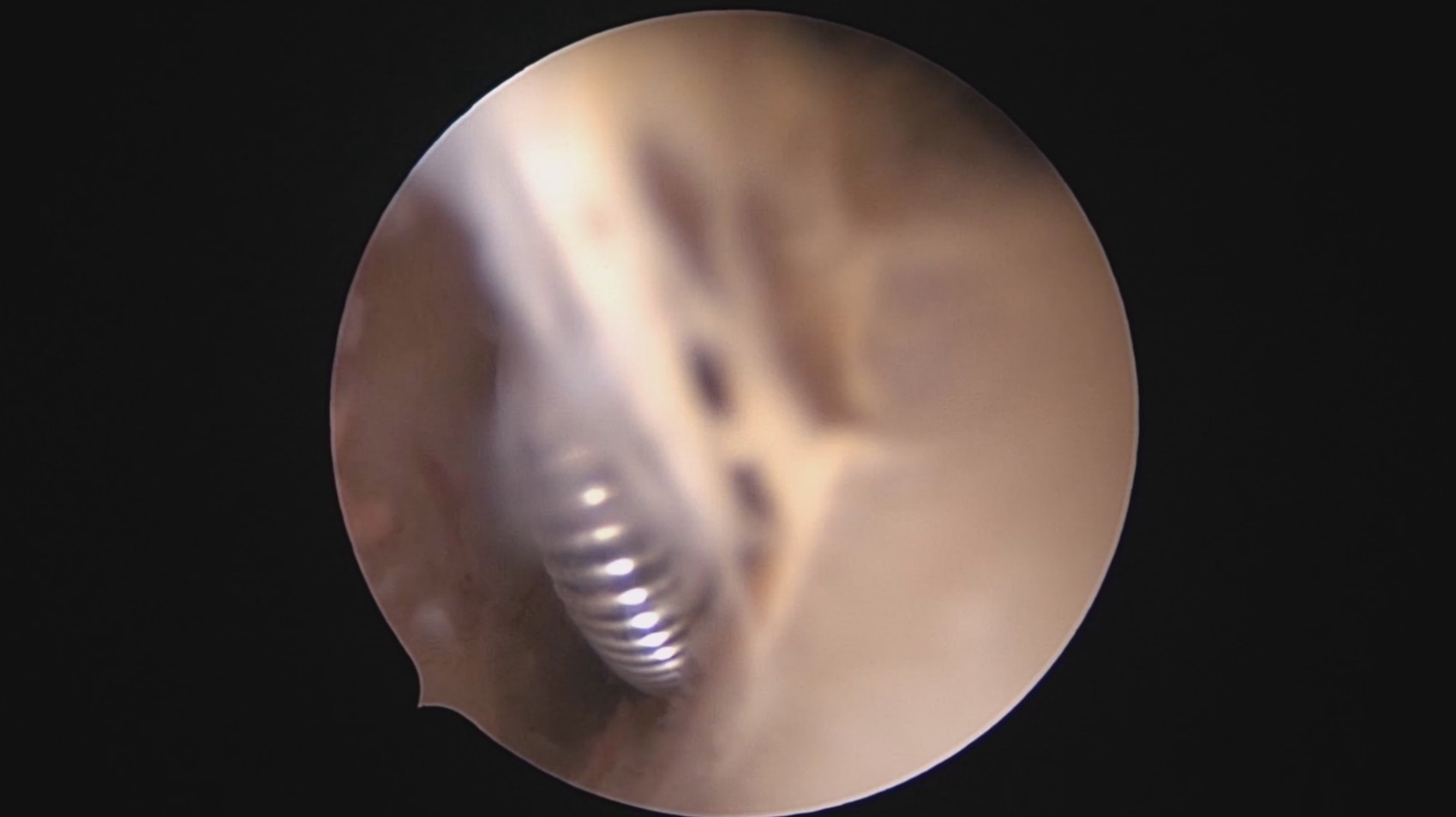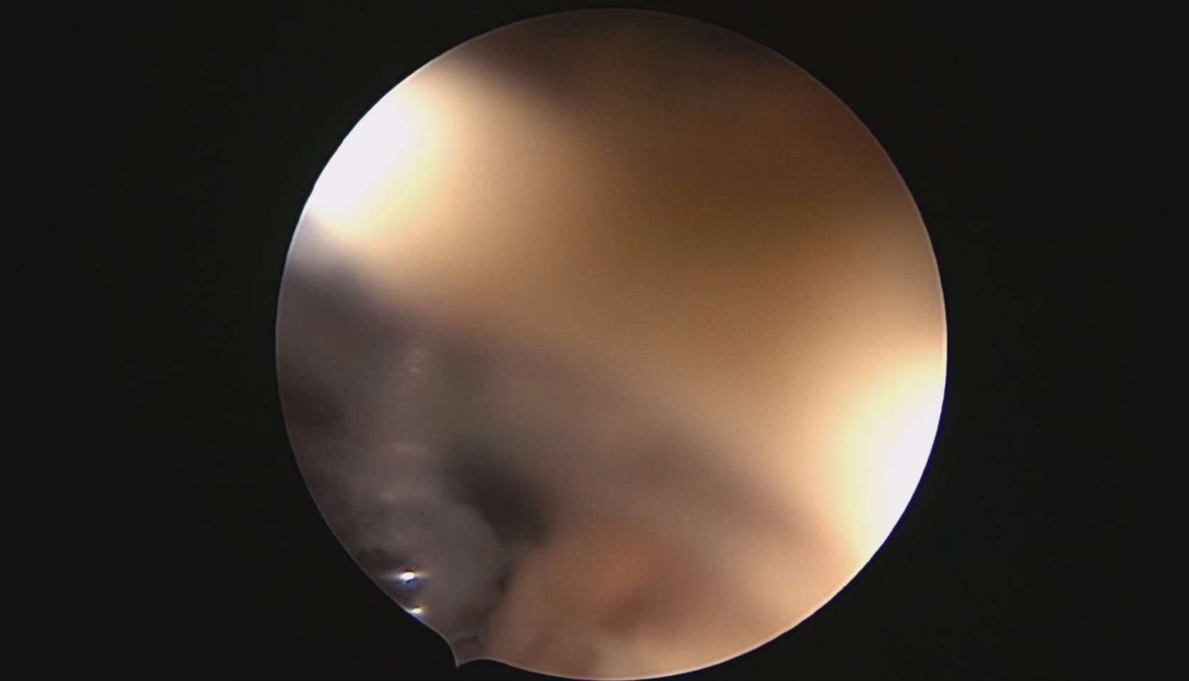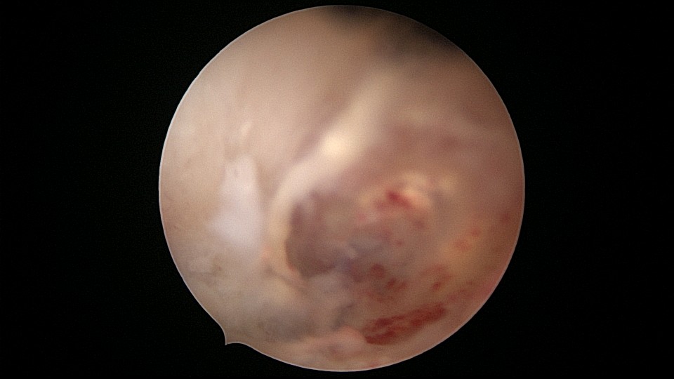 患者28岁,G7P3,顺产3次,完全纵膈子宫,单宫颈。2015年、2018年顺产,2019年左侧宫腔计划外妊娠行宫腔镜取胚及左侧宫腔放置γ环(推测既往妊娠左侧宫腔妊娠可能性大)。2023年4月带环受孕(应该为右侧宫腔妊娠),2023年12月足月阴道分娩,分娩时试图取出左侧宫腔内节育器,因操作困难,取环失败。2024年2月顺产后67天,要求取出宫内节育器,左手臂放置皮埋避孕棒。B超提示环距宫底1.1cm,环两翼分别距子宫前壁浆膜面0.4cm,距子宫后壁浆膜面0.3cm。宫腔镜术中膨宫困难,见宫颈管及宫腔少许淡黄色脓液流出,γ环逆时针旋转约80度,两臂指向左侧宫腔前后壁(2019年放置环时亦如此,因单侧宫腔前后径大于横径所致)。异物钳取出节育环,左右侧宫腔均见散在黄色机化组织,未取病检。