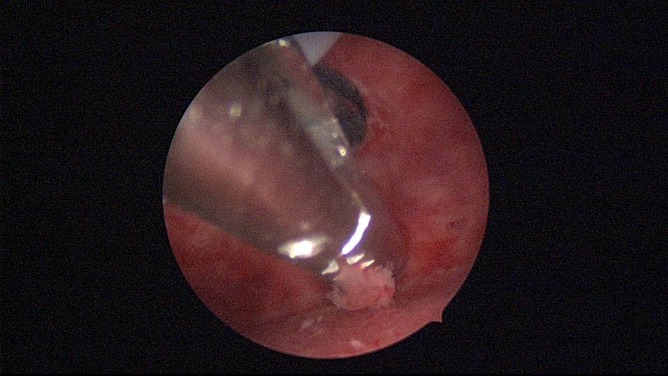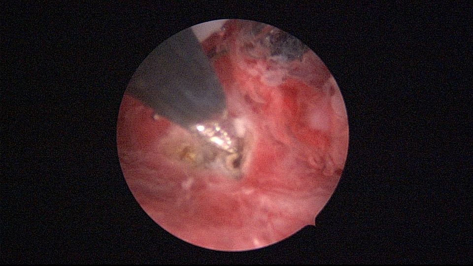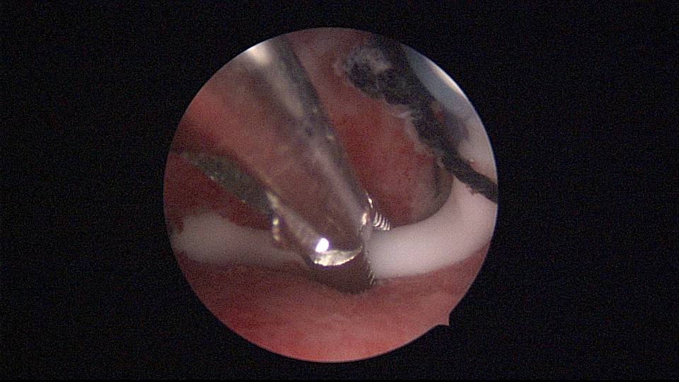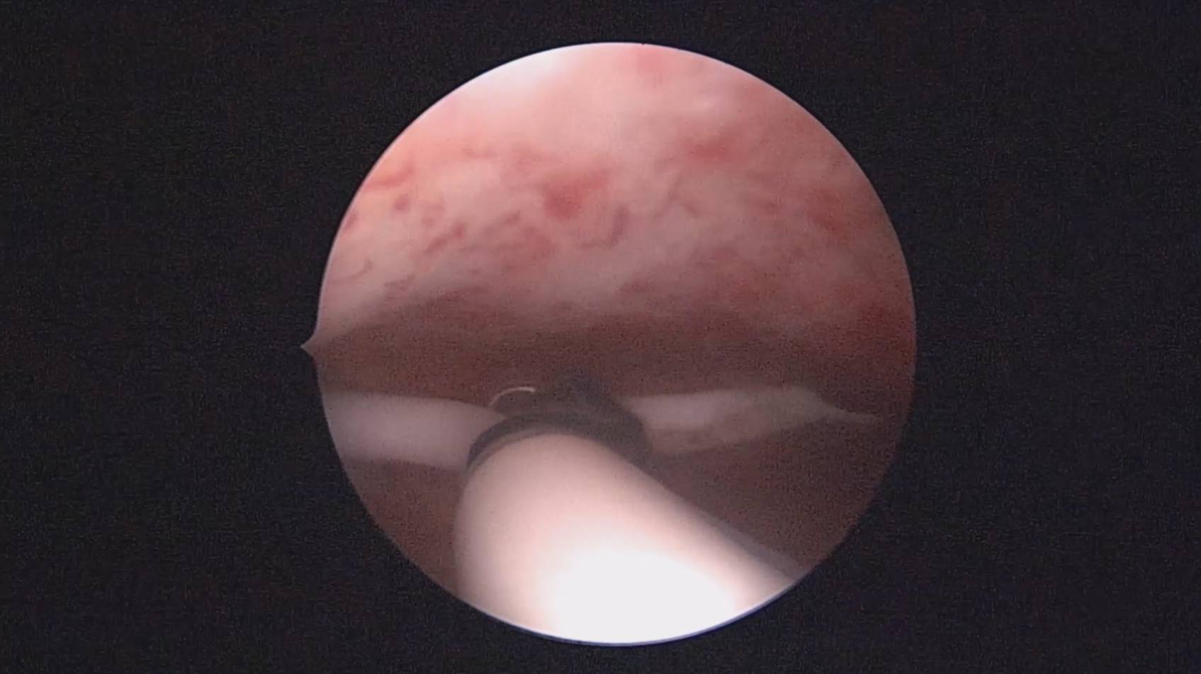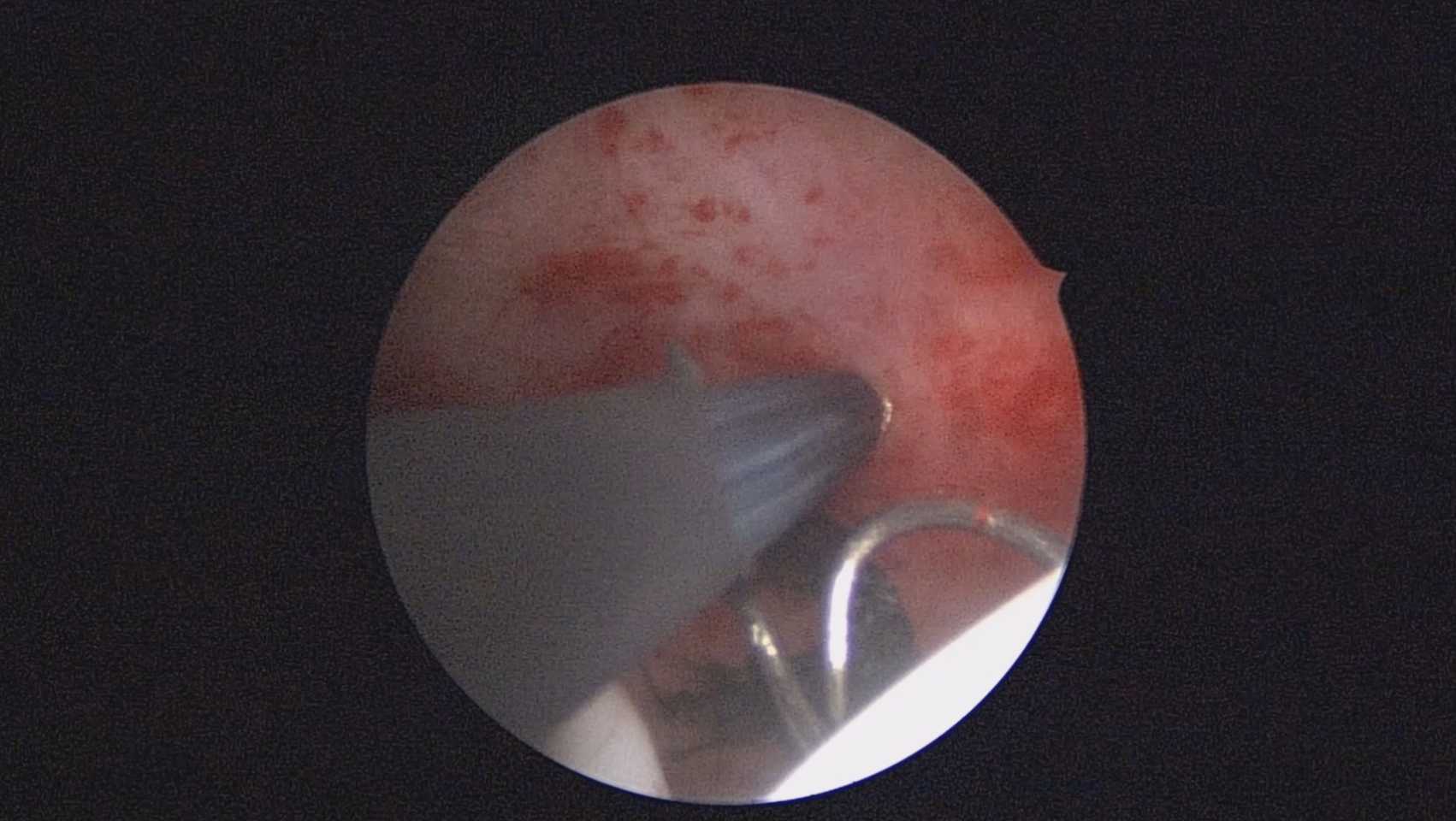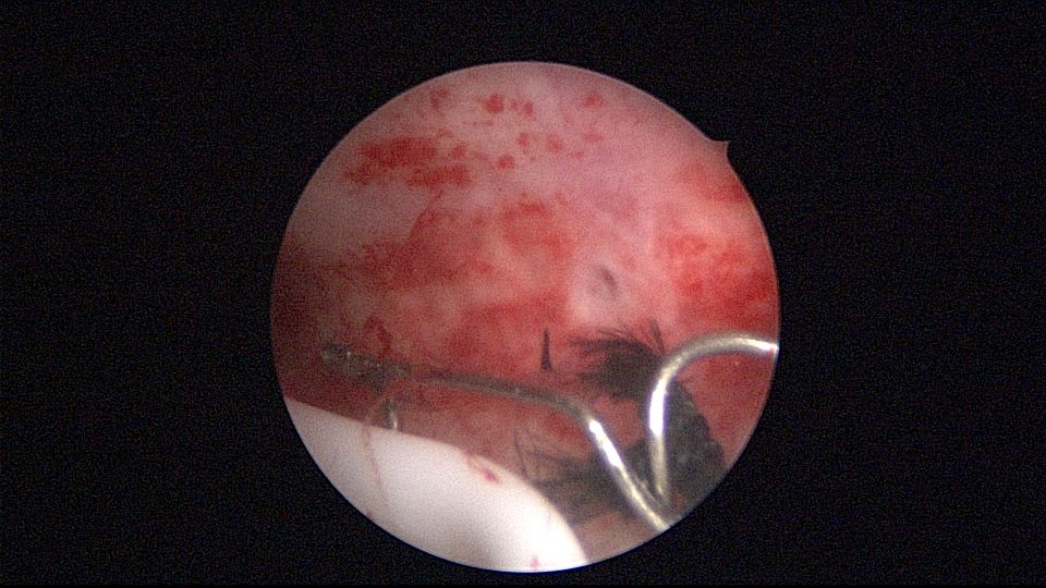 患者40岁,G0P0,原发不孕10+年,20+岁严重痛经,多家医院行腹腔镜手术治疗腺肌症合并多发性肌瘤,宫腔镜切除内膜息肉,前后肌注GnRH-a6针,痛经明显缓解。2017年试管助孕一次,失败,放弃生育需求,现要求放置曼月乐环并固定。2024年5月行宫腔镜下曼月乐不锈钢挂钩固定,子宫前位,宫深7cm,宫腔形态正常,宫内膜正常,双侧输卵管开口可见,将曼月乐环用4号丝线与挂钩连接并固定于宫底(第一次做宫腔镜下节育环固定,没有想到利用曼月乐尾丝连接环)。2024年6月复查B超,曼月乐固定装置扎入宫底肌层0.46cm,环位置正常,2025年5月复查B超,曼月乐顶端距宫底1.5cm。