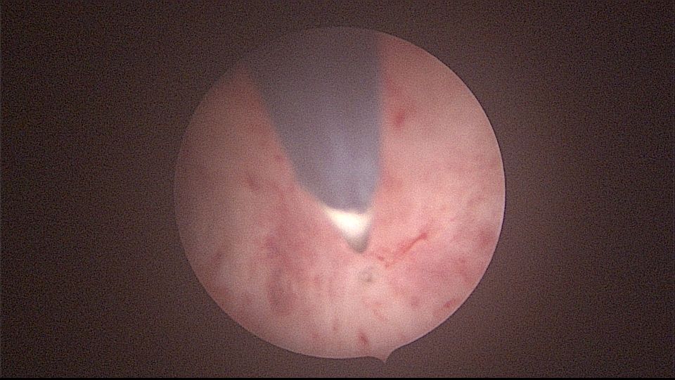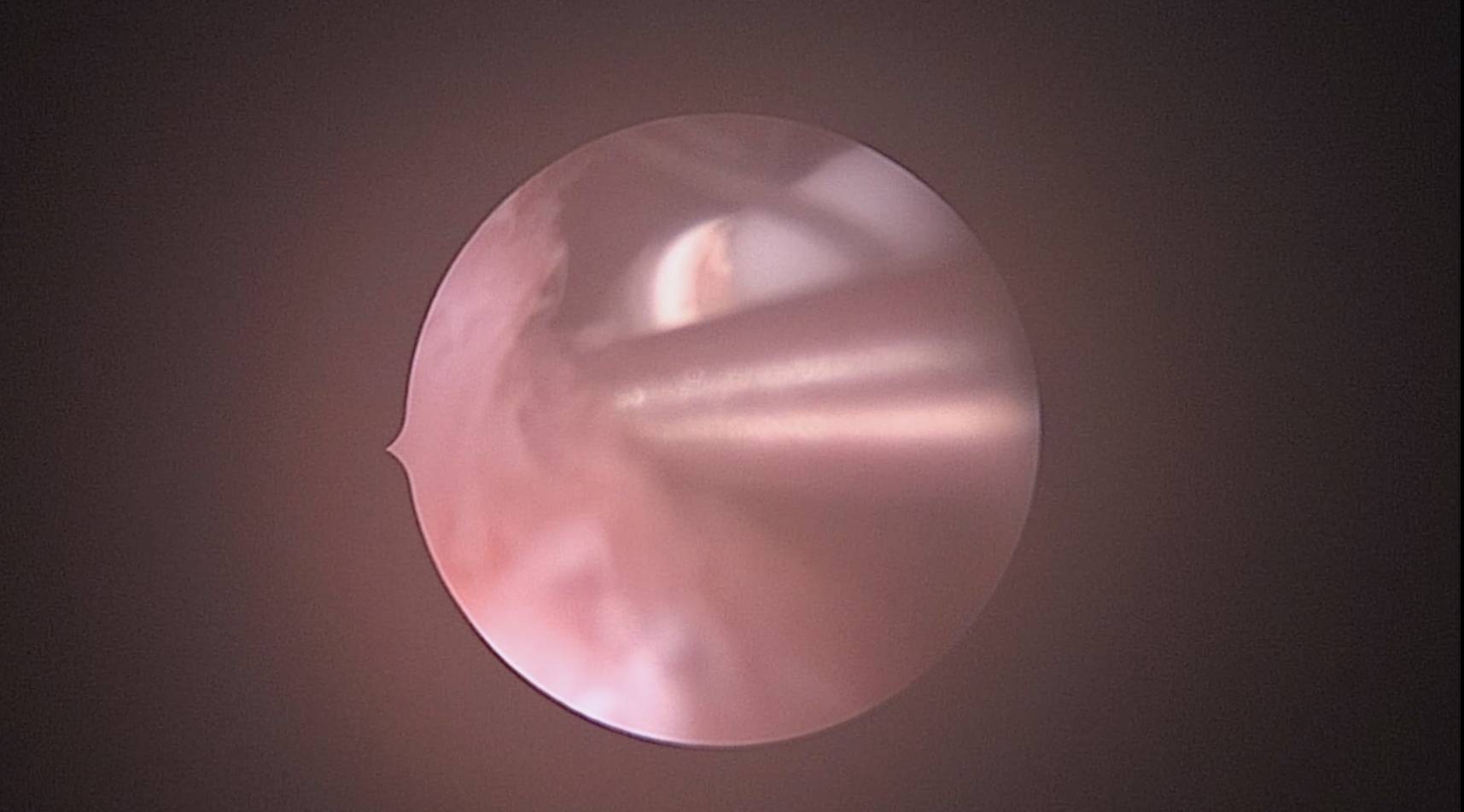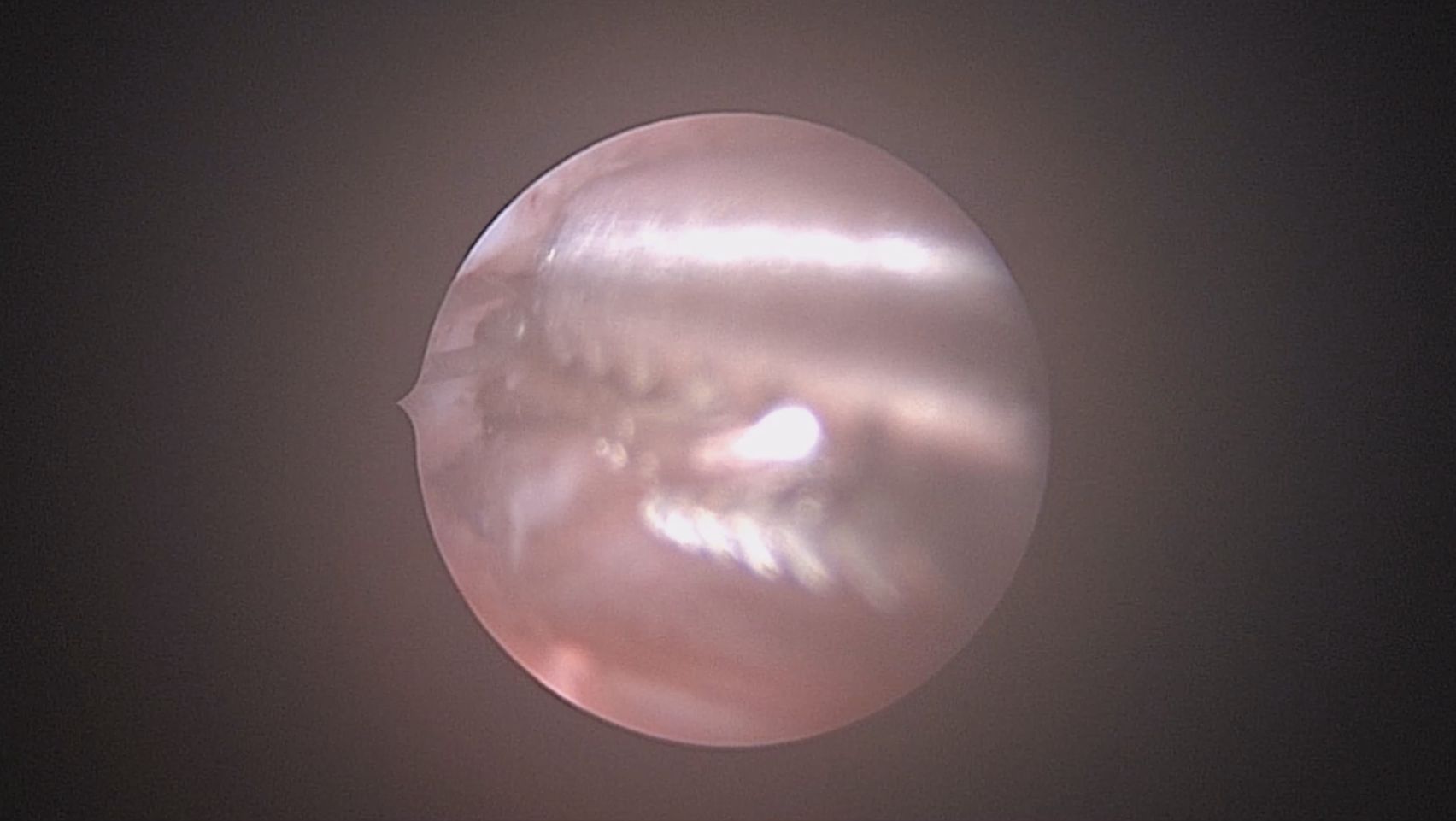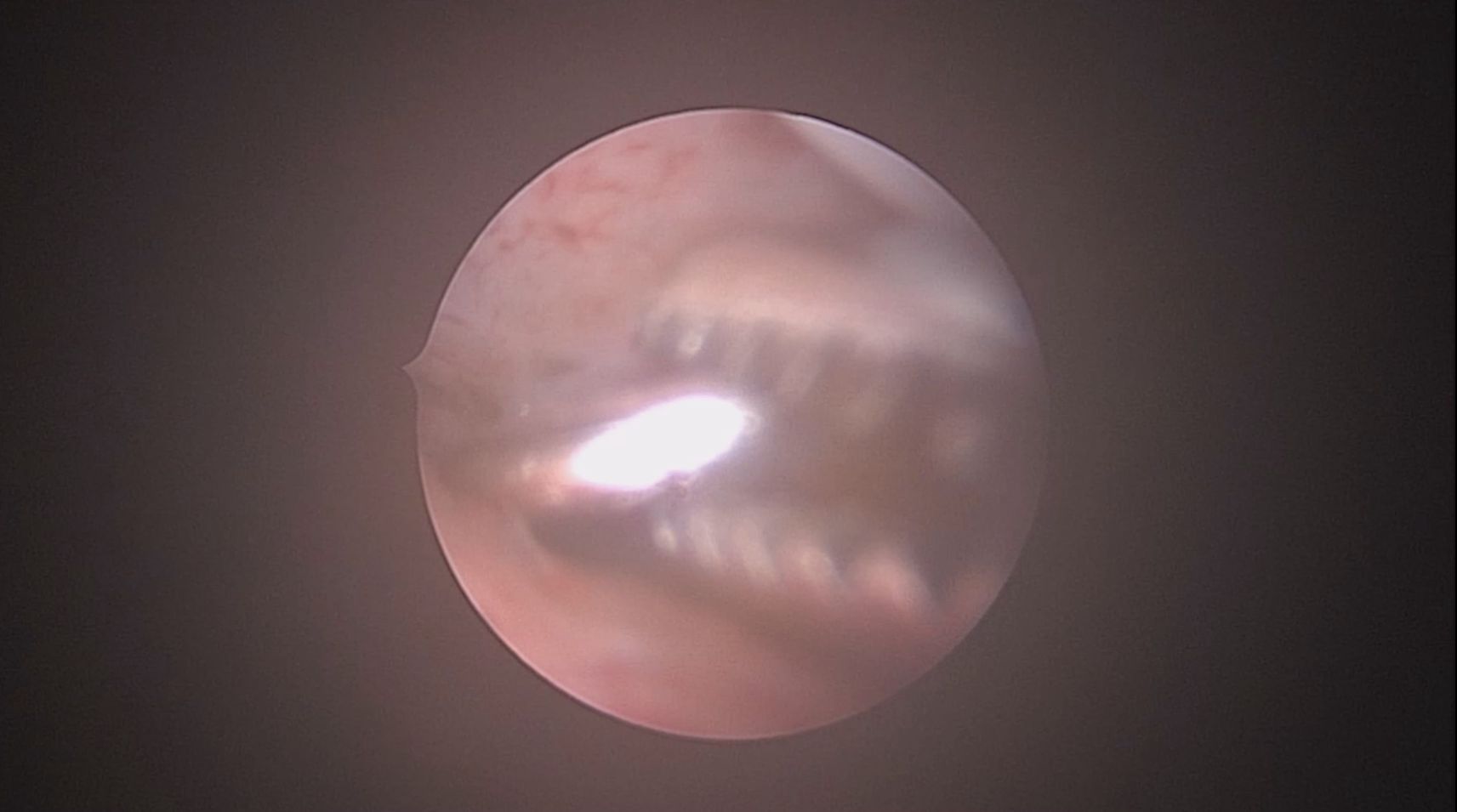 患者38岁,G5P1,顺产1次,因子宫腺肌症于2020年放置曼月乐环,2024年5月B超提示曼月乐顶端距宫底约2.3cm,内膜厚约1.2cm(双侧),回声欠均匀,近2月月经淋漓不净。2024年6月来院要求更换曼月乐并固定,宫腔镜见原曼月乐环位置正常,顺利取出,诊刮。放置新的曼月乐,用环尾丝连接曼月乐与挂钩,将挂钩插入宫底肌层。术中膨宫不良,视野欠清晰。2024年7月复查B超节育环顶端距宫底1.9cm,挂钩距宫底0.4cm,环位置正常。病检为血凝块中见少许破碎宫内膜腺体,呈分泌抑制,部分间质疏松水肿,蜕膜样变。
