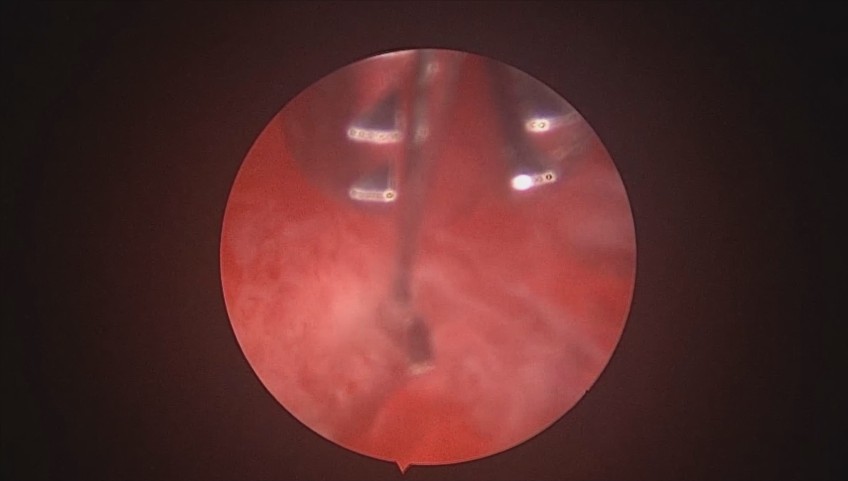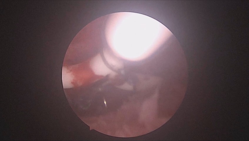 患者37岁,G3P1,剖宫产1次。子宫腺肌症合并子宫肌瘤6年,月经量增多1年。B超子宫前位,6.6cm*5.5cm*5.8cm大小,子宫后壁肌瘤直径6cm。2024年12月宫腔镜探查,宫深9cm,放置曼月乐并固定。用曼月乐尾丝在环横臂中间套扎形成线圈,异物钳夹持线圈挂到不锈钢挂钩里,将环固定于宫底,患者及家属拒绝内膜送病检。术后多次复查B超,曼月乐位置正常,最后一次环顶端距宫底1.2cm。