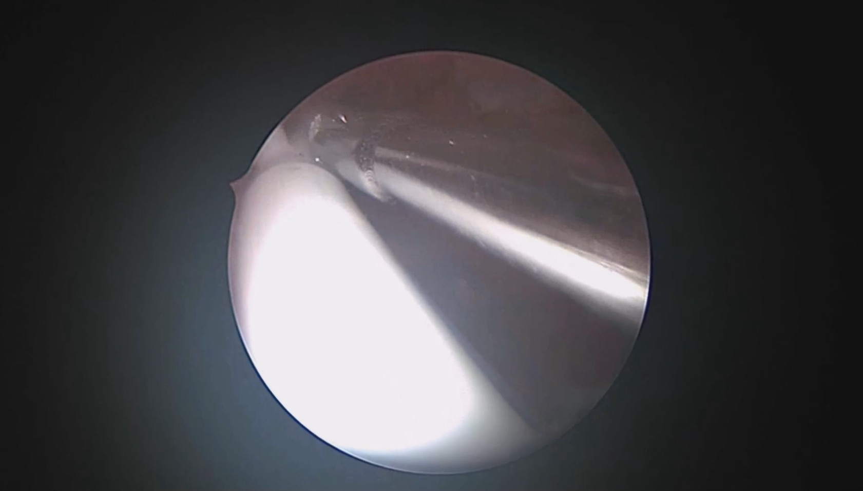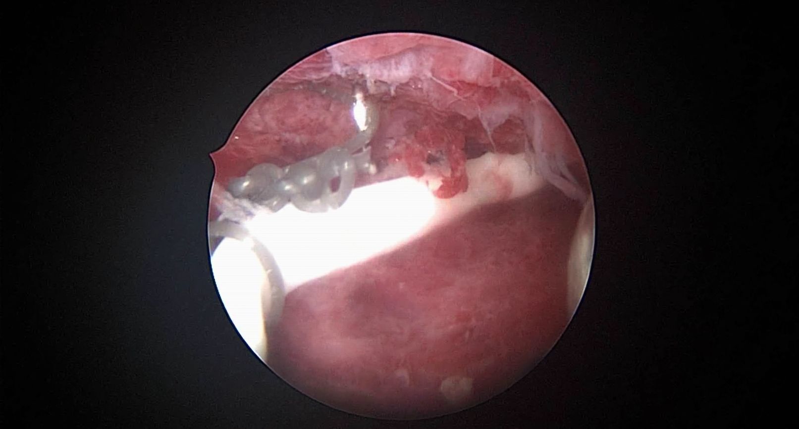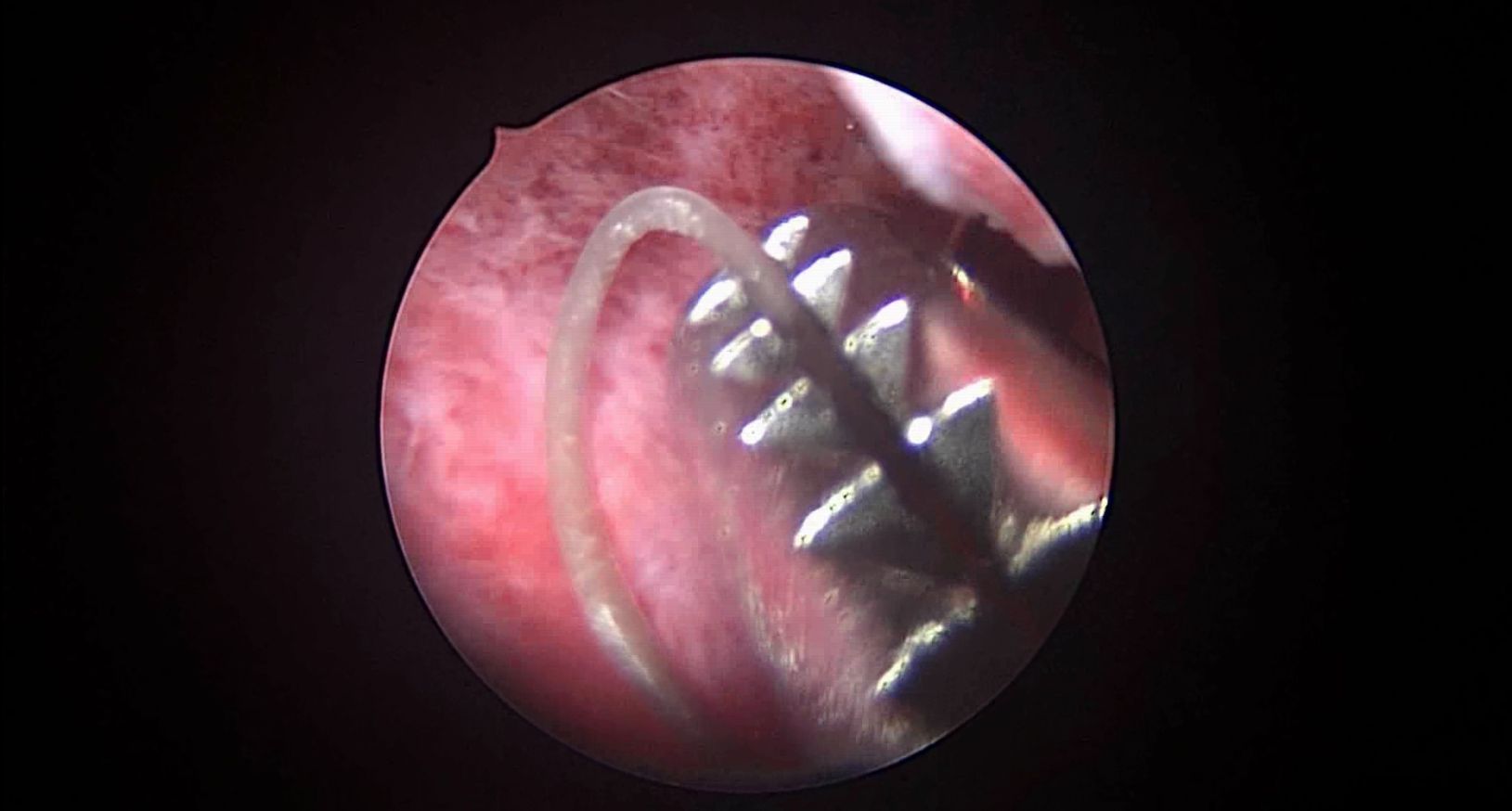 患者41岁,G4P2,顺产2次。因异常子宫出血于2023年12月在外院行宫腔镜检查,取内膜病检为增生晚期及分泌早期宫内膜组织,另见宫内膜息肉,术后药物治疗效果不佳,月经周期不规律。本次阴道不规则流血10+天,量多就诊。宫腔镜下尝试线结扣宫底锚定曼月乐,将结推人宫底肌层很困难,最后采用不锈钢挂钩固定。用曼月乐尾丝连接环与不锈钢挂钩,将挂钩插入宫底肌层,异物钳原位固定曼月乐,退出宫腔镜,结束手术。术后患者未回院复查节育环位置。