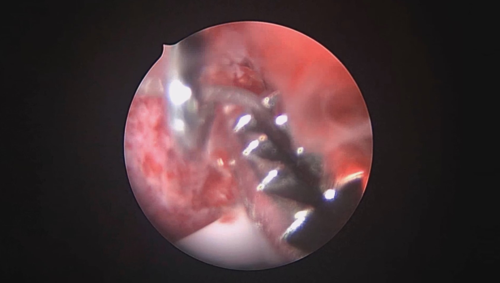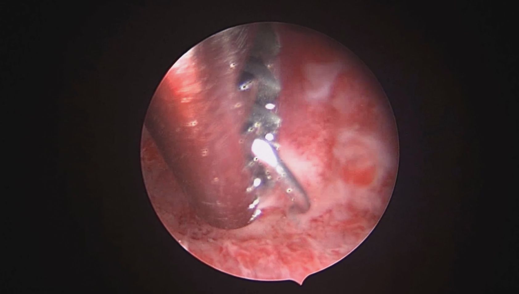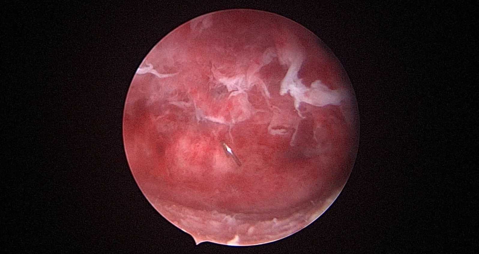 患者41岁,G4P2,顺产2次。因异常子宫出血于2023年12月在外院行宫腔镜检查,取内膜病检为增生晚期及分泌早期宫内膜组织,另见宫内膜息肉,术后药物治疗效果不佳,月经周期不规律。本次阴道不规则流血10+天,量多就诊。宫腔镜下尝试线结扣宫底锚定曼月乐,将结推人宫底肌层很困难,最后采用不锈钢挂钩固定。用曼月乐尾丝连接环与不锈钢挂钩,将挂钩插入宫底肌层,异物钳原位固定曼月乐,退出宫腔镜,结束手术。术后患者未回院复查节育环位置。
