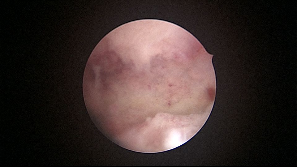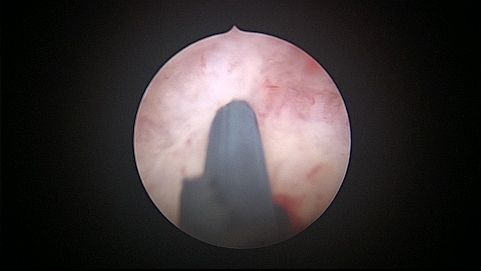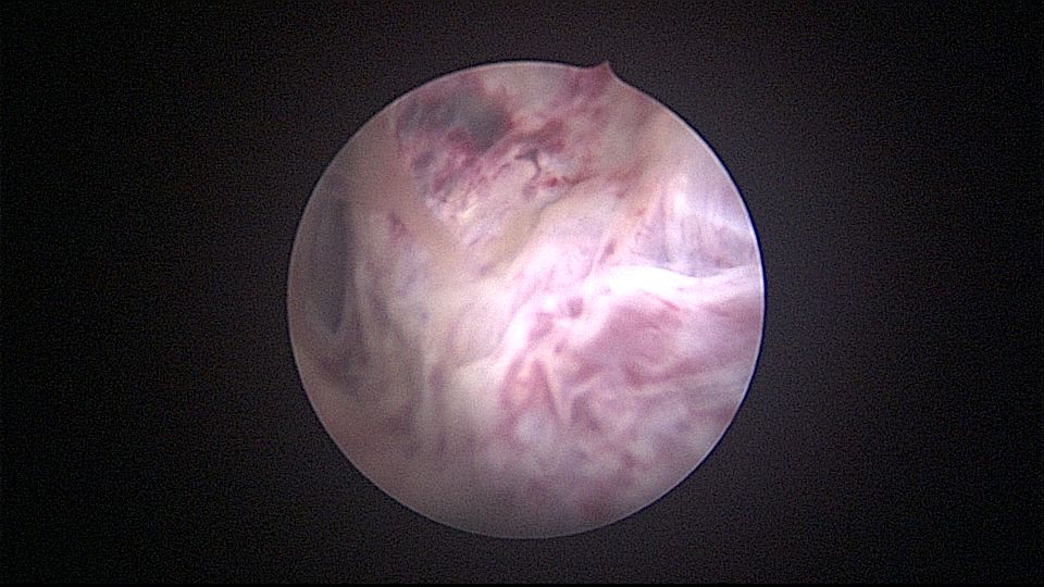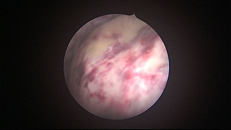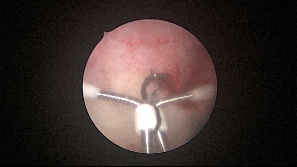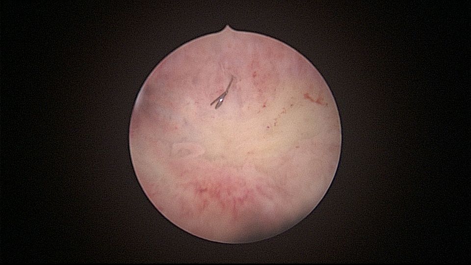 患者32岁,G6P2,顺产2次。2025年3月,停经56天,计划外妊娠,要求终止妊娠并放置节育环,考虑终止妊娠后宫腔大,担心环移位或脱落,要求固定节育环。γ环没有尾丝,用4号丝线连接环及不锈钢挂钩,将挂钩插入宫底肌层固定,异物钳原位固定曼月乐,退出宫腔镜,结束手术。术后患者未回院复查节育环位置。