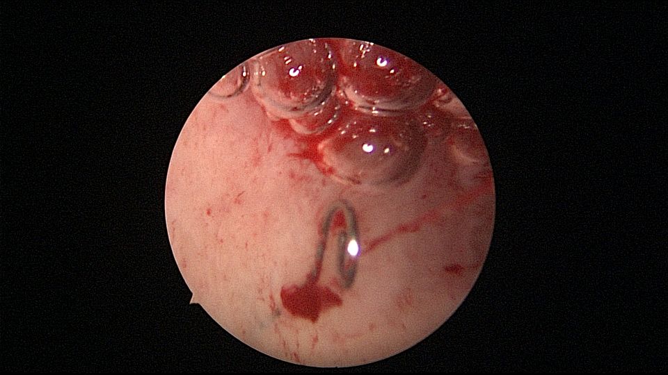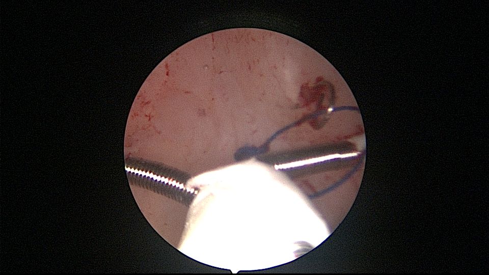 患者33岁,G9P2,顺产2次。2023年7月因节育环嵌顿行宫腔镜取环,2025年3月,停经50+天,计划外妊娠,要求终止妊娠并放置节育环,考虑终止妊娠后宫腔大,担心环移位或脱落,要求固定节育环。用4-0不可吸收线连接环与挂钩,将挂钩插入宫底肌层固定节育环。2025年5月复查B超,节育环位置正常,环顶端距宫底1.8cm。