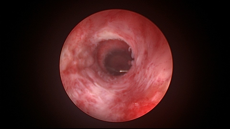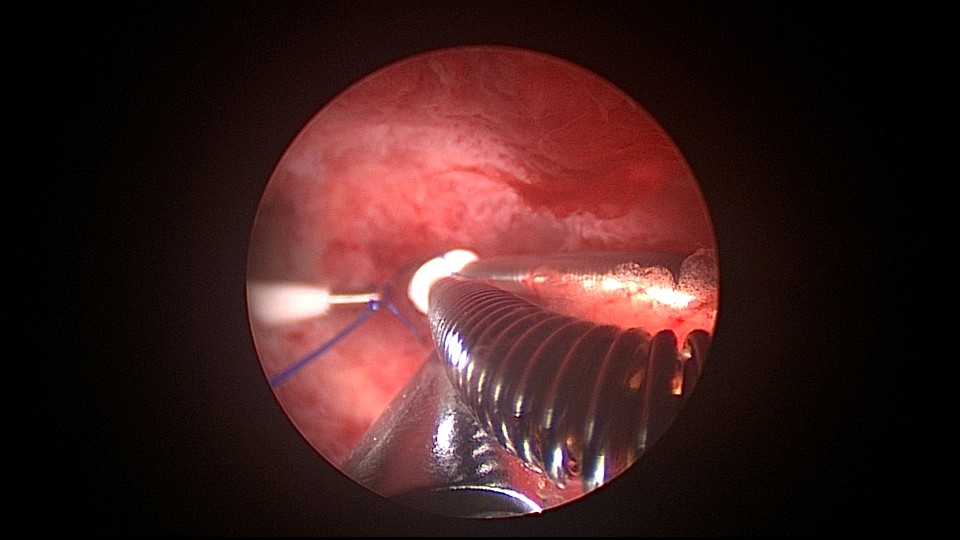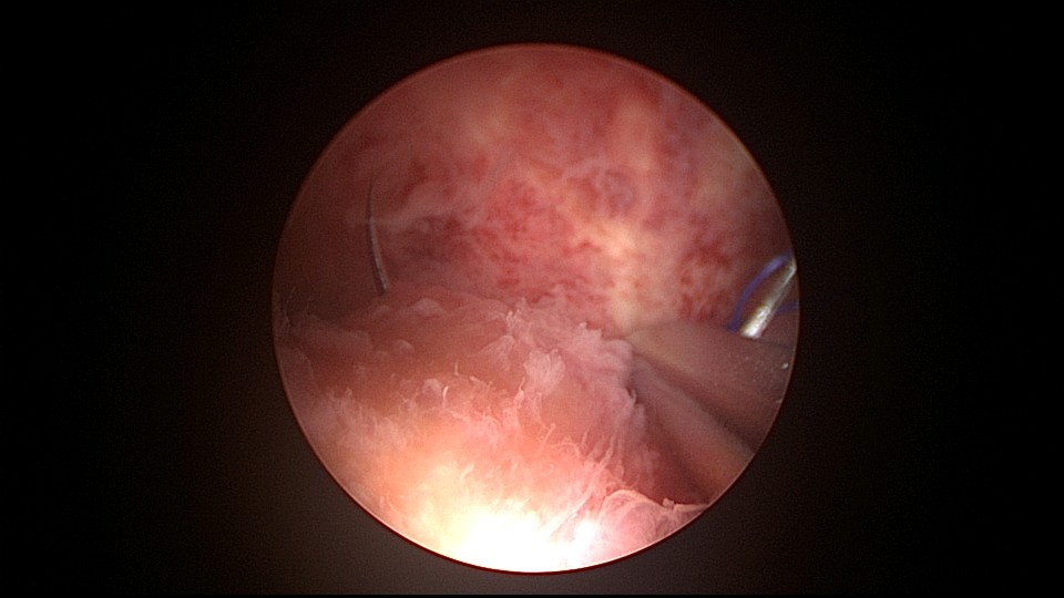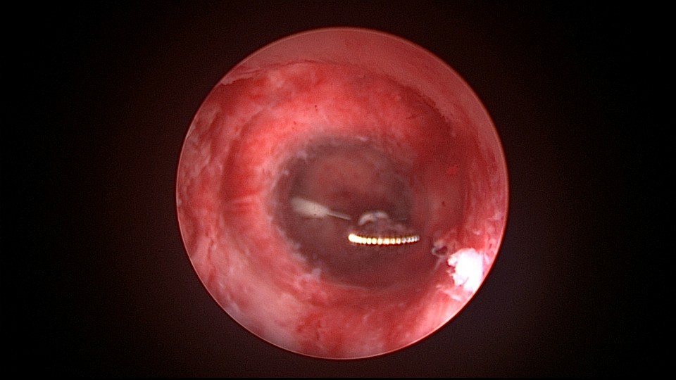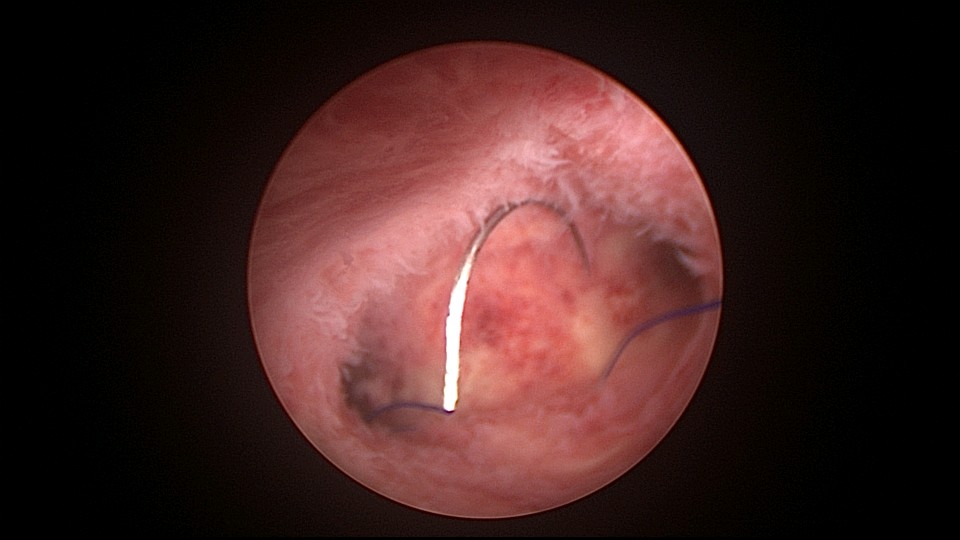 患者38岁,G5P1,剖宫产1次。2023年1月节育环下移带环受孕,宫腔镜取环终止妊娠,同时行左手上臂内侧皮埋避孕,遗憾的是手术医生术中没有找到节育环,术毕复查B超,环仍在宫腔,第二天宫腔镜探查,节育环位于切口憩室内,取出节育环。再次遗憾的是取环后阴道淋漓不净出血,术后第24天复查B超见胚物残留,第三次宫腔镜手术清除残留组织。2025年10月取出皮埋棒,2025年11月外院安环,术后2周复查B超环下移,2025年12月(月经干净3天后),安环医院取出节育环,取环后第6天到我院行宫腔镜安环并做节育环固定。子宫水平位,宫深8.5cm,见切口憩室比宫腔更宽大,形成类似金字塔形状(2次节育环下移原因),行宫腔镜下缝合线结固定节育环,打了3个结,拉过缝合点2个结。第十七例节育环固定。既往带环受孕,多次宫腔镜手术。术后2周复查B超,节育环位置正常,环顶端距宫底1.6cm。