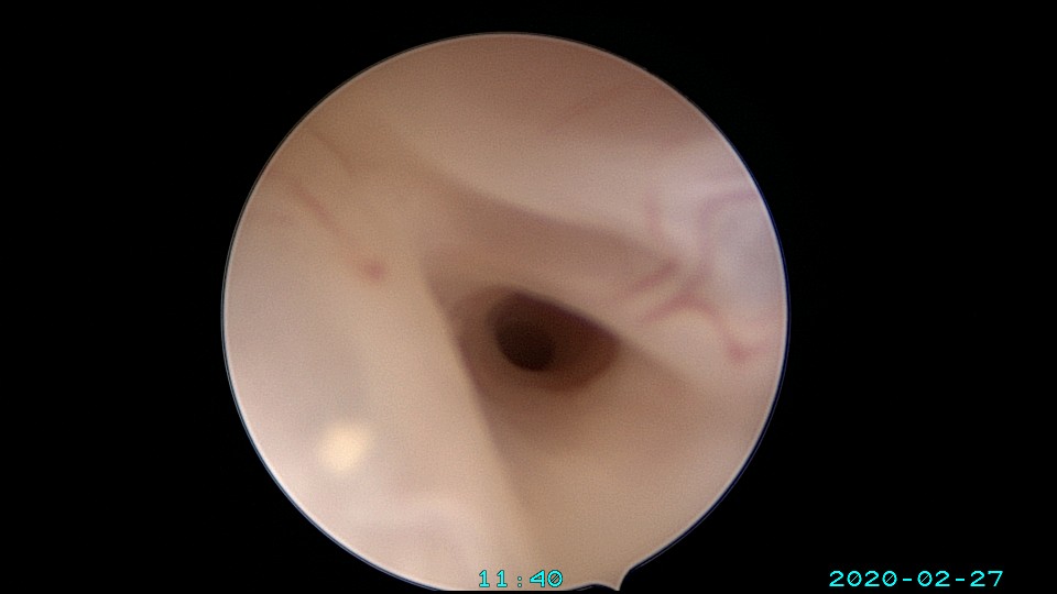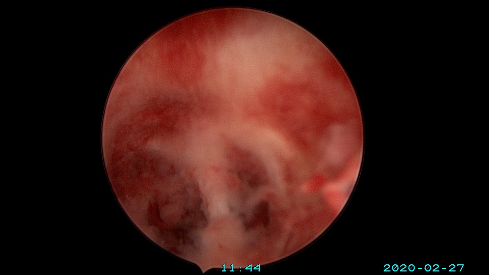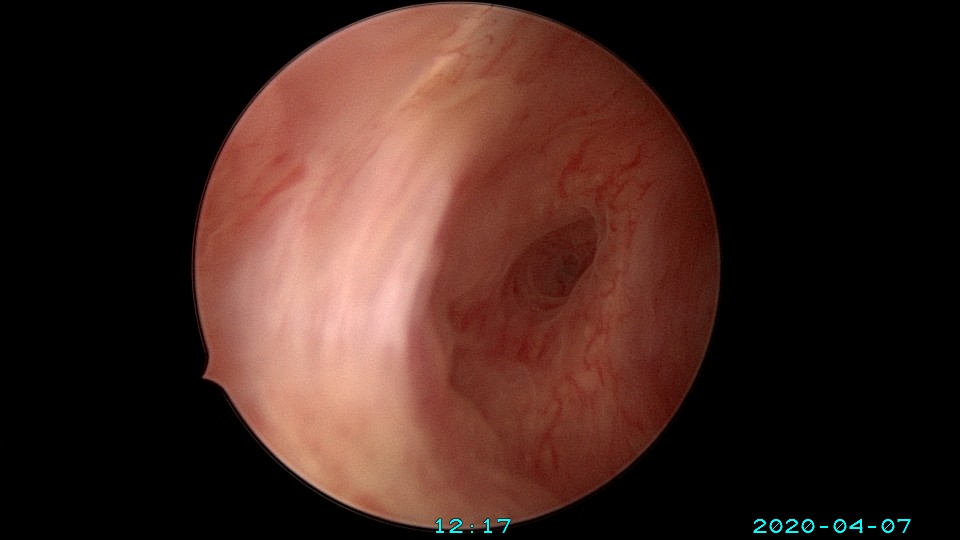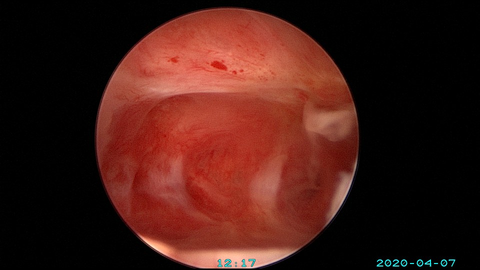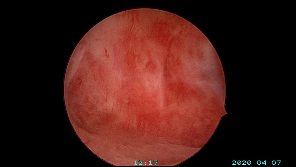 患者39岁,G3P1 ,2018年8月外院人流术后月经逐渐减少,2018年12月开始闭经。因再婚要求生育,2020年2月因闭经1+年,行宫腔镜探查,术中见宫颈管及宫腔封闭粘连,单极电切分粘,恢复宫腔形态,见少许残留内膜,未取到内膜送病检,双侧输卵管开口不可见。2020年4月宫腔镜二探取球囊,宫腔形态正常,右侧输卵管开口仍不可见,左侧输卵管开口可见,开口周围见少许正常内膜。2020年6月,患者打电话给我说,停经47天,感胸部胀痛。我第一个想法是粘连复发,月经出不来了,叫病人来院复查(误听为腹部胀痛)。没想到B超检查怀孕了,很惊讶,太意外了。生命就是这么神奇,这个小生命从贫瘠的土壤里获得了新生,茁壮成长,35+周孕剖宫产分娩。现45岁,G4P2。另,球囊对宫腔的持续塑型,对后期输卵管开口显露有好处。