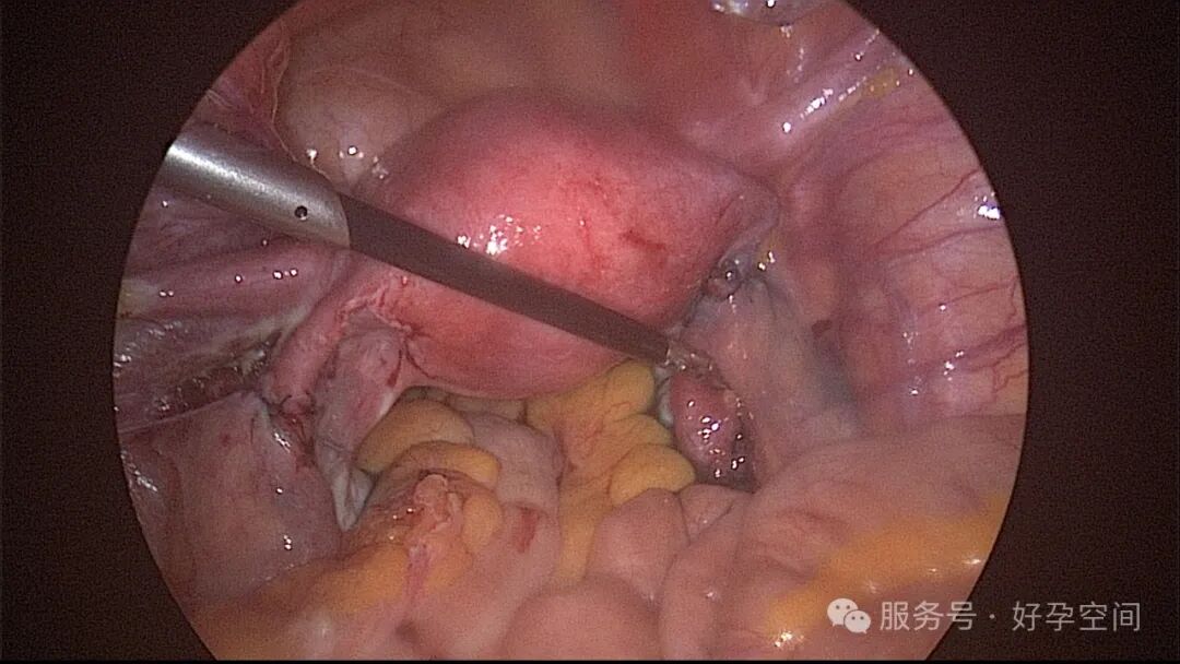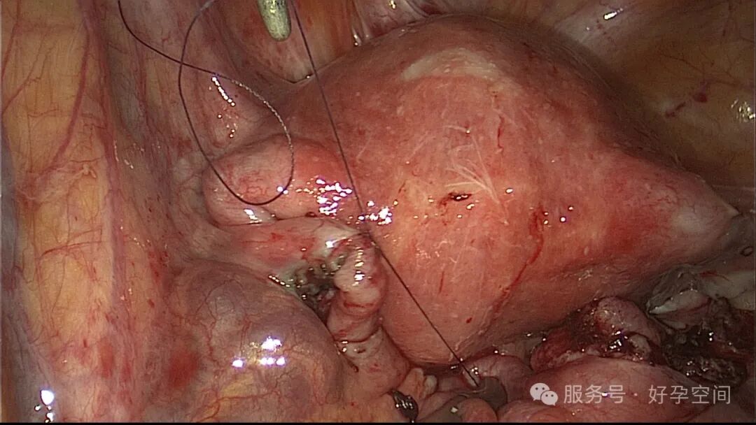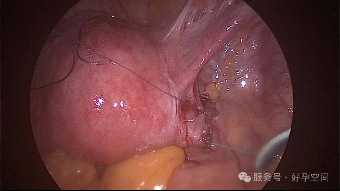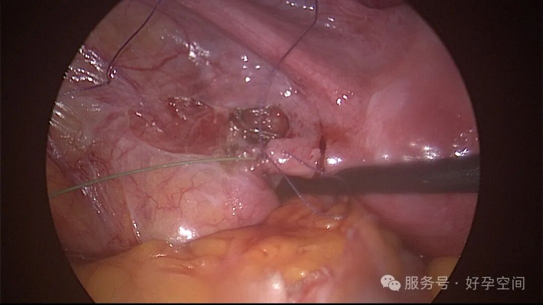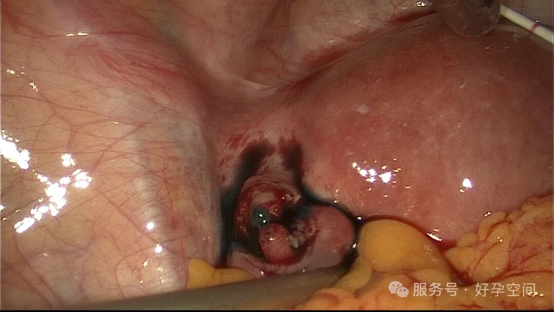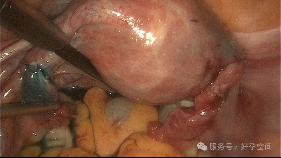 病例6:35岁,G3P3,剖宫产3次。输卵管结扎5年,再婚,2023年6月手术,见剖宫产切口憩室,双侧输卵管开口太阳征(输卵管炎),子宫偏向右侧,输尿管导管做支架,美蓝通液双侧输卵管伞端未见美蓝液流出。2023年11月自然妊娠,2024年6月孕37+1周剖宫产分娩。
