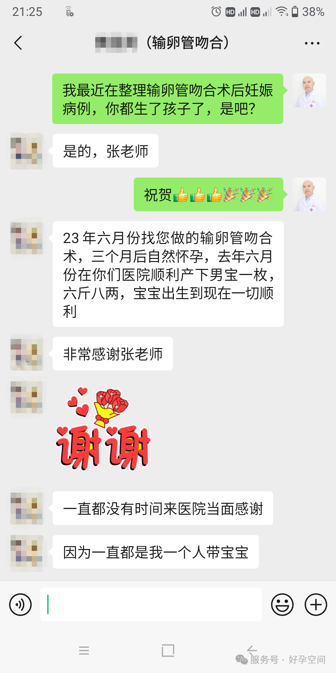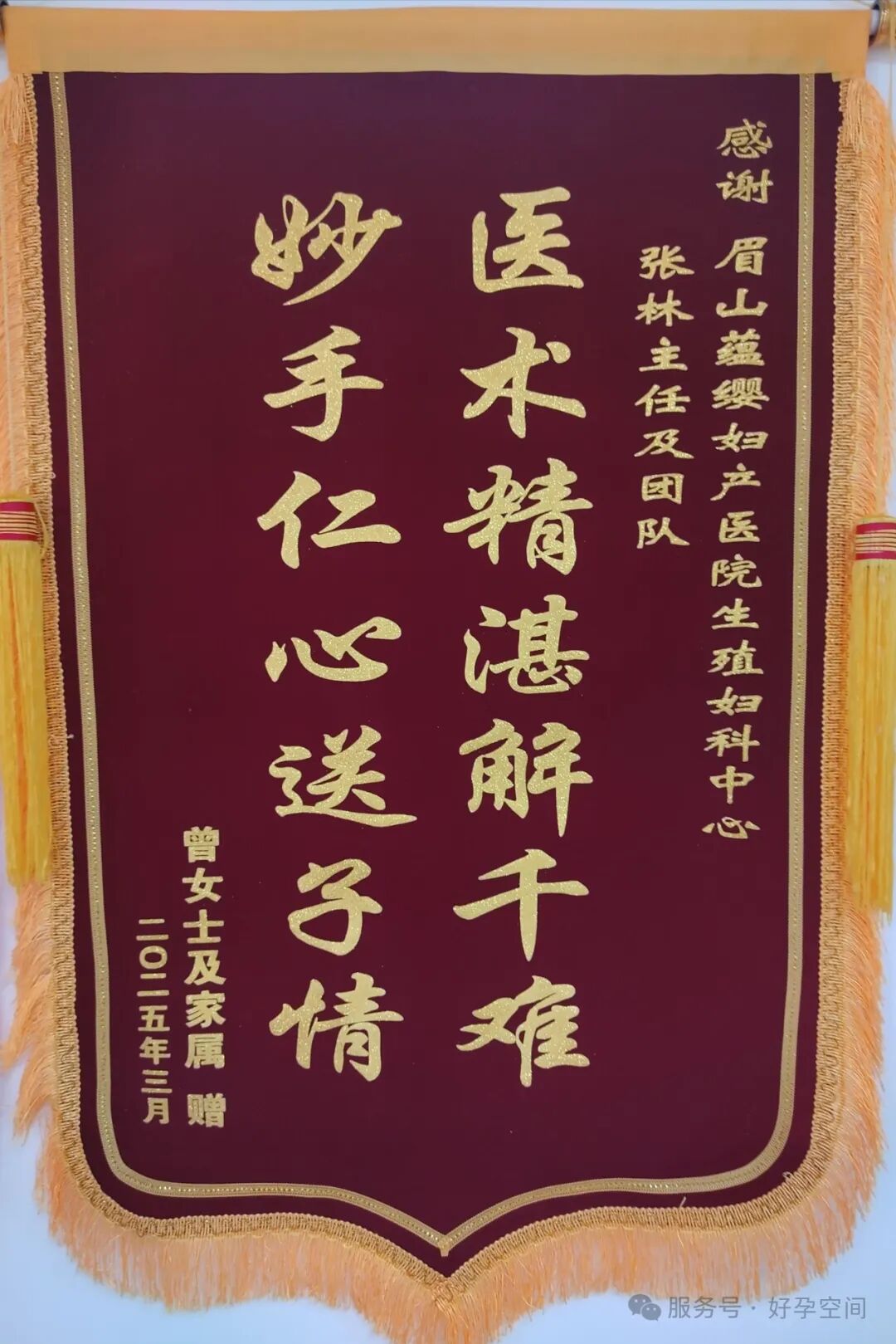 病例8:34岁,G3P2,剖宫产2次。输卵管结扎8年,再婚,2024年2月手术,COOK导丝做支架,美蓝通液双侧输卵管伞端少许美蓝液流出。2024年9月13+3周孕建卡,2025年3月37+4周孕剖宫产分娩,赠送手术医生锦旗一面。
