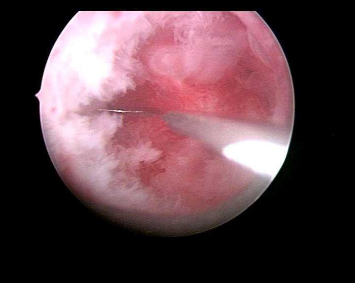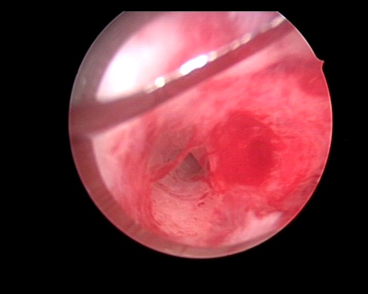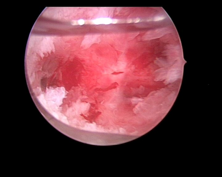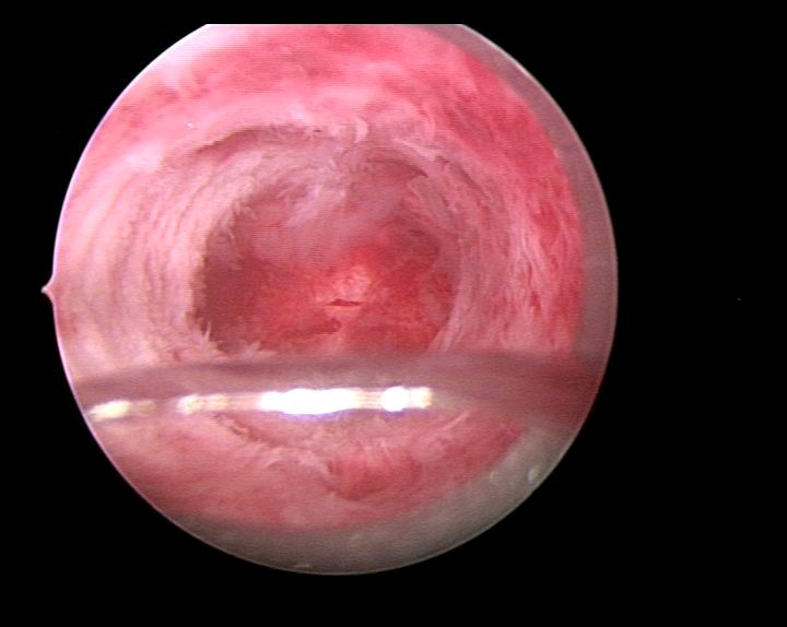 患者29岁,G1P0,人流术后闭经半年,2015年宫腔镜探查,发现宫颈管粘连,宫腔两侧粘连,冷刀(钩型刀)切割粘连,恢复宫腔形态,显露双侧输卵管开口。术后偶尔监测排卵试孕2年未孕,又过了1年,2018年不经意间自然妊娠,足月分娩。现40岁,G2P1。