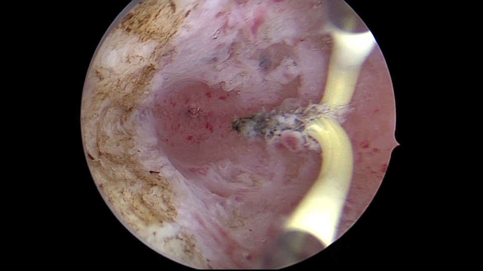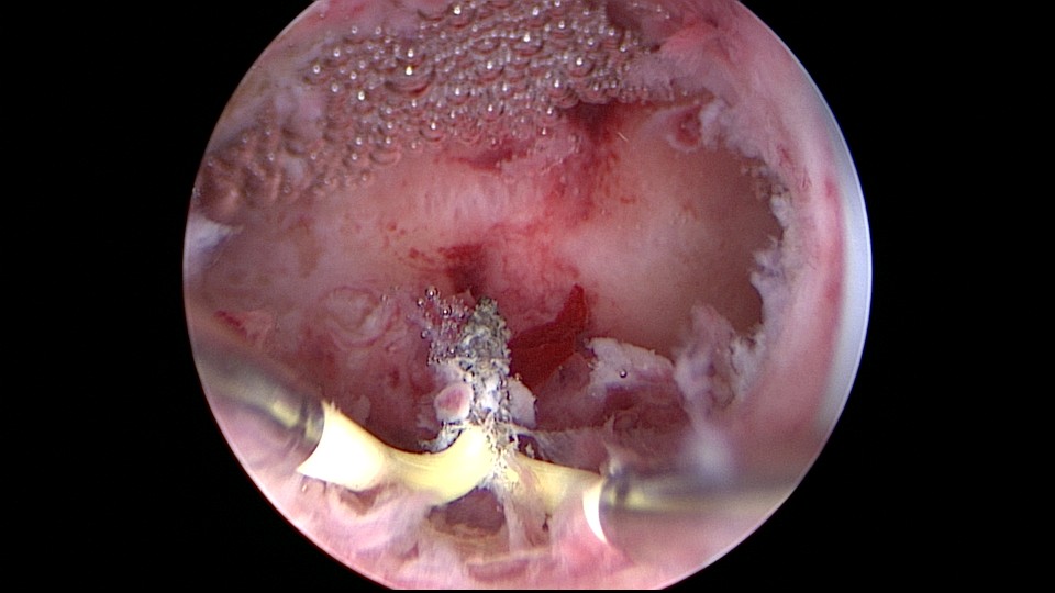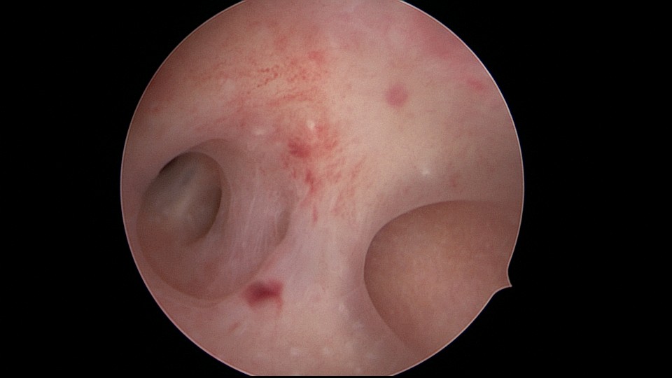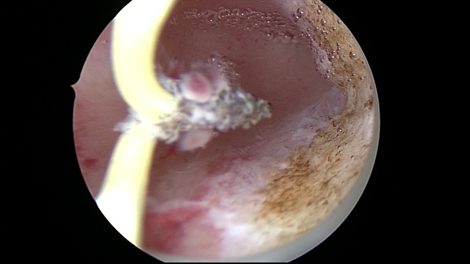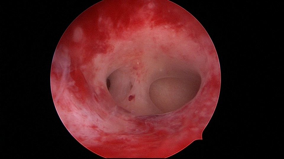 患者35岁,G5P0,继发不孕10年,10年前外院开腹宫外孕手术1次,试管失败1次。外院B超提示宫腔粘连,2021年4月在成都西囡妇科医院做宫腔镜检查,发现宫腔粘连。2021年11月到我院做宫腔镜分粘手术,术中见宫腔两侧及右侧宫角致密粘连,内膜片状充血,单极电切分粘,恢复宫腔形态,显露双侧输卵管开口。2021年12月宫腔镜二探取球囊,宫腔形态正常,双侧输卵管开口可见。分粘后再次试管成功,足月分娩。现40岁,G6P1。
