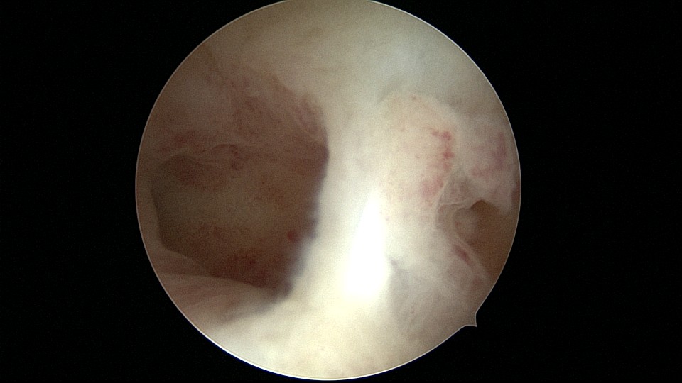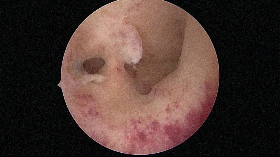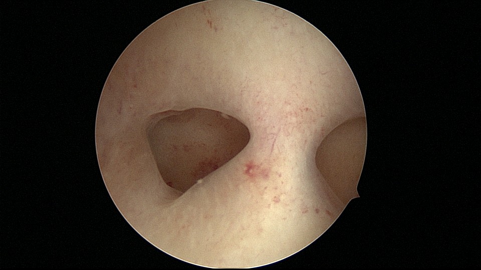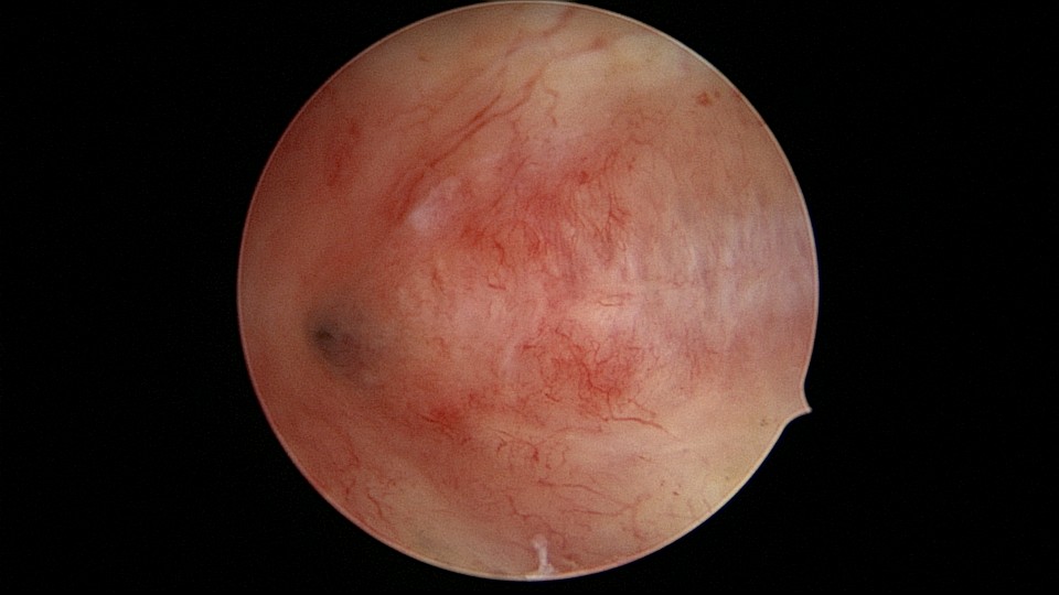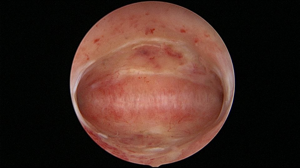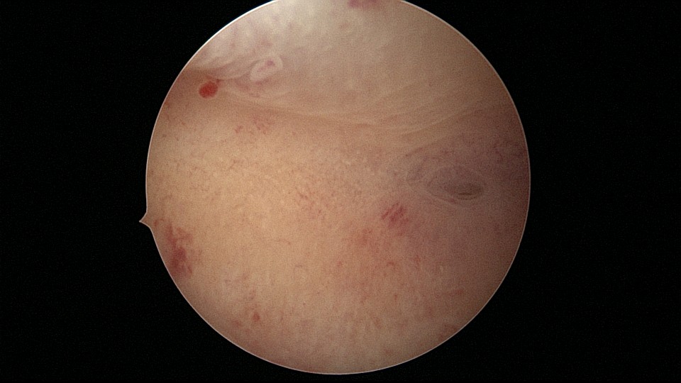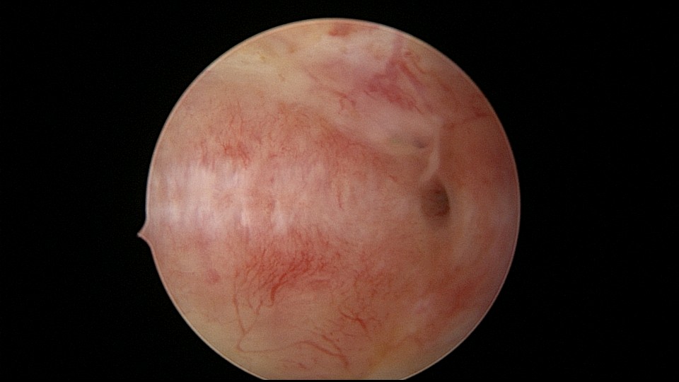 患者28岁,G1P0,2019年11月孕9周胎停1次,药流清宫,术后月经量逐渐减少,淋漓不净。外院B超发现宫腔粘连,2021年6月初宫腔镜探查,宫腔两侧及右侧宫角粘连,单级电针分粘,恢复宫腔形态,显露双侧输卵管开口(术中图像采集系统突发故障,分粘及分粘后图片未采集到)。2021年6月底宫腔镜二探取球囊,宫腔形态正常,双侧输卵管开口可见。2022年12月自然妊娠,足月顺产。现33岁,G2P1。