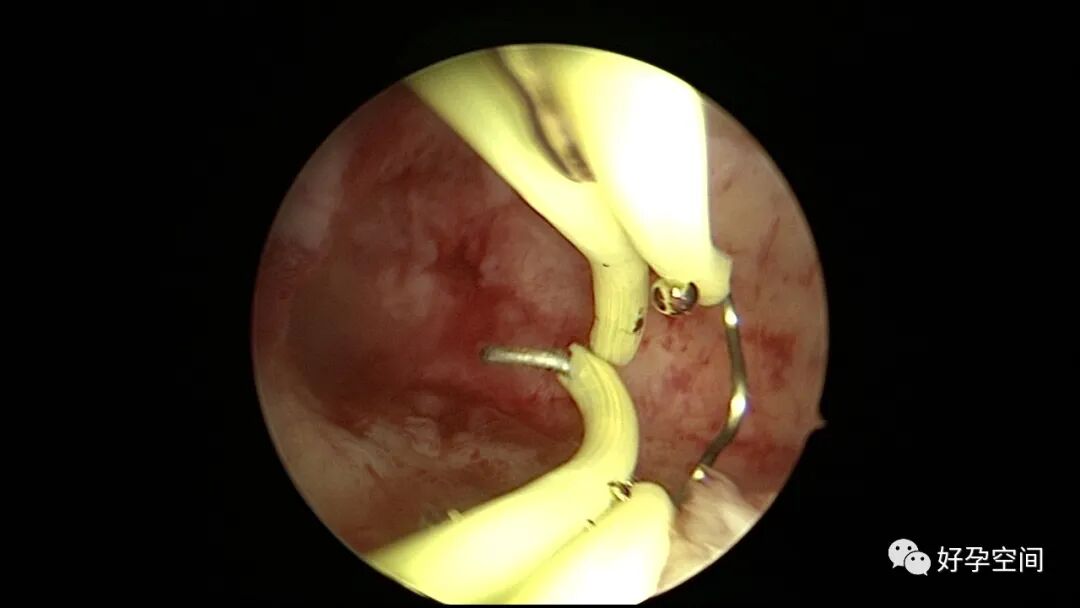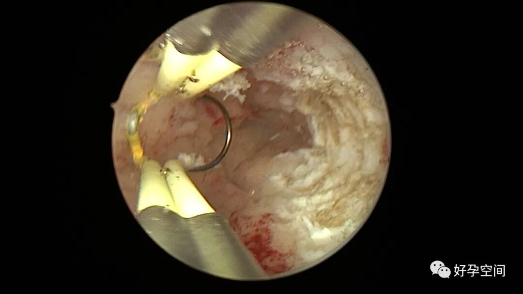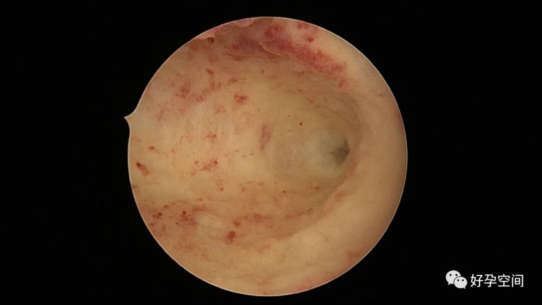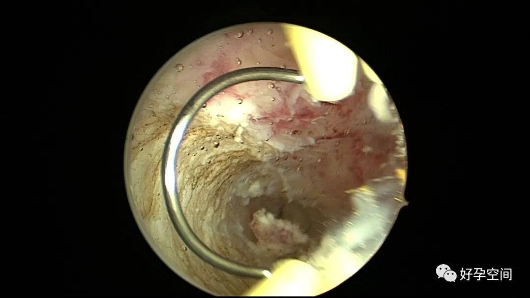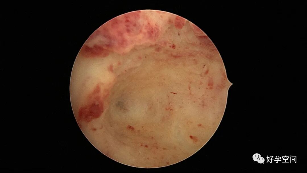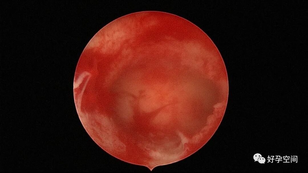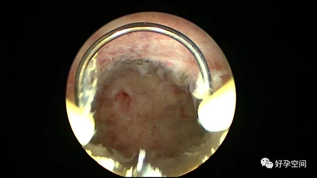病例2:患者31岁,原发不孕,2019年11月在重庆某妇幼保健院做宫腹腔镜手术疏通输卵管,术中未取内膜活检,术后未孕。2021年7月在成都某大型生殖中心试管怀孕双胎(移植前未做宫腔镜检查及内膜活检),2021年11月孕4月双胎破水,在达州当地医院引产清宫,清宫术后40天复诊B超提示宫腔胚物残留。2022年1月到我院(眉山蕴缨妇产医院)行宫腔镜手术切除残留组织,2022年4月宫腔镜术后3个月复诊B超提示宫腔粘连,再次来我院行宫腔镜分粘。宫腔被覆一层沙丘状质脆增生组织,宫腔下段两侧壁内聚,行分粘术,取内膜送病检。
