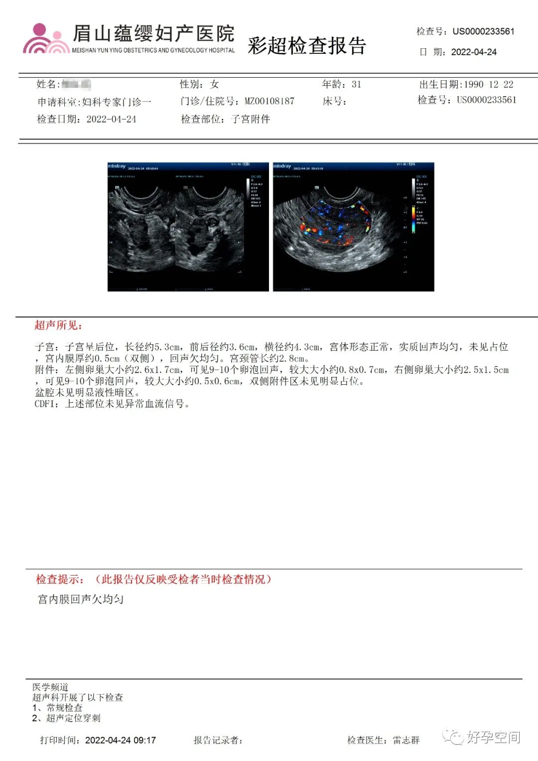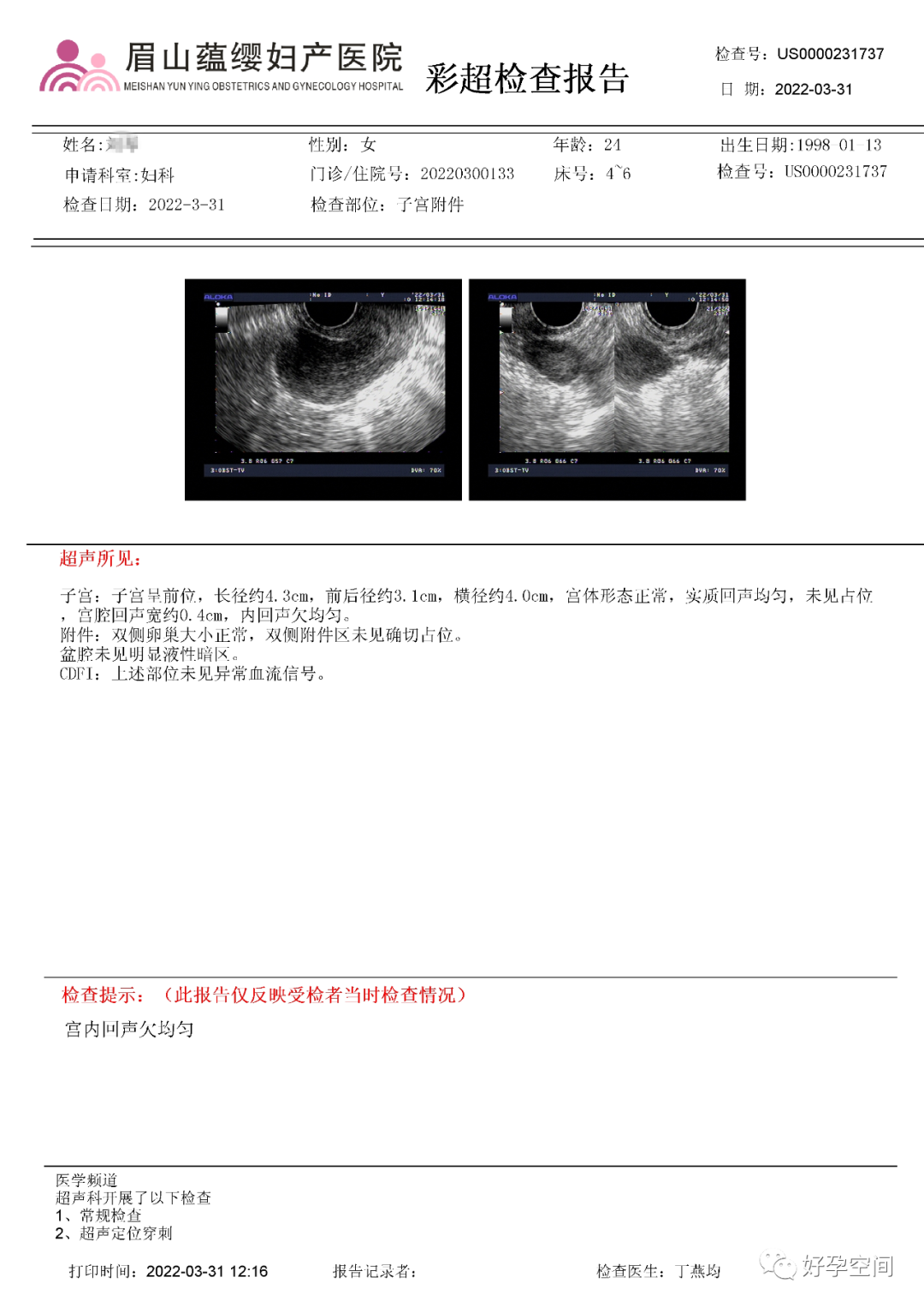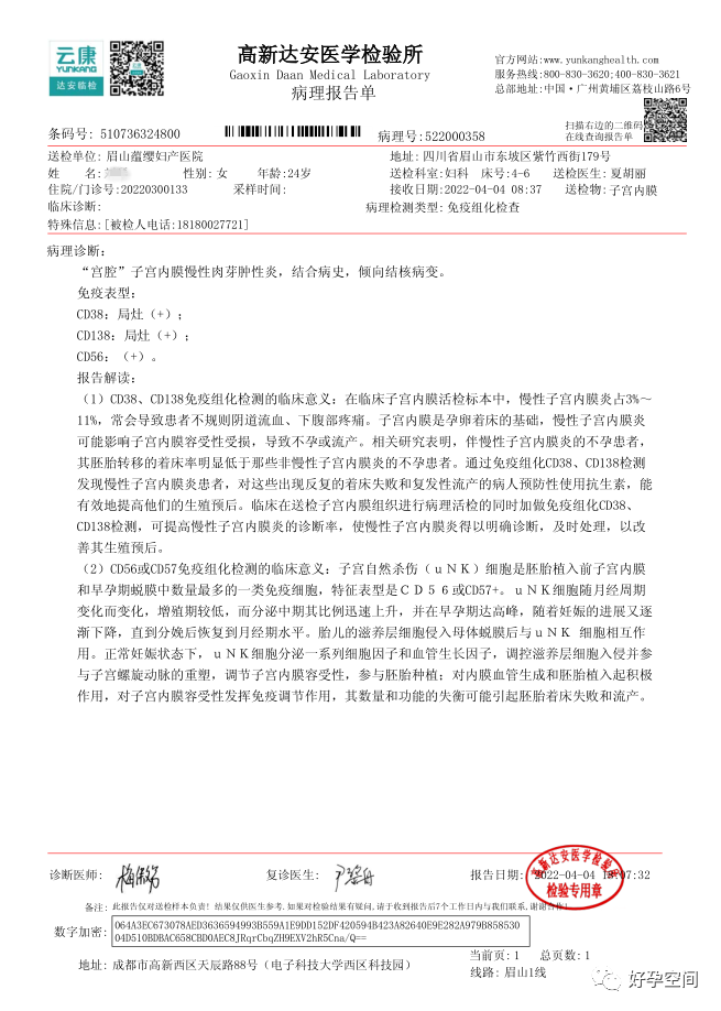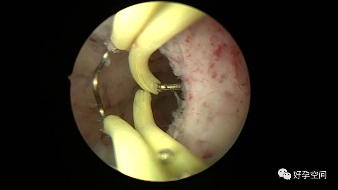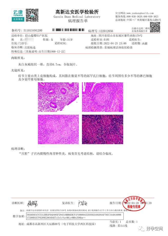 病例2:患者31岁,原发不孕,2019年11月在重庆某妇幼保健院做宫腹腔镜手术疏通输卵管,术中未取内膜活检,术后未孕。2021年7月在成都某大型生殖中心试管怀孕双胎(移植前未做宫腔镜检查及内膜活检),2021年11月孕4月双胎破水,在达州当地医院引产清宫,清宫术后40天复诊B超提示宫腔胚物残留。2022年1月到我院(眉山蕴缨妇产医院)行宫腔镜手术切除残留组织,2022年4月宫腔镜术后3个月复诊B超提示宫腔粘连,再次来我院行宫腔镜分粘。宫腔被覆一层沙丘状质脆增生组织,宫腔下段两侧壁内聚,行分粘术,取内膜送病检。