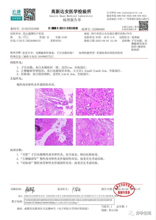 病例1:患者24岁,原发不孕,造影示双侧输卵管堵塞,否认结核病史,无结核病家族史。2022年4月以不孕症收入院手术,术前化验检查无明显异常,胸片示左肺下叶内带稍高密度结节影。行宫腹腔镜探查,宫腔被覆一层棉絮状质脆增生组织,宫腔狭小,宫壁僵硬。腹膜及大网膜广泛分布粟粒样结节,左侧输卵管充满干酪样组织及灰色脓液。