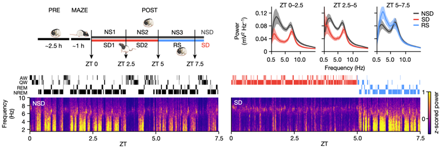 海马尖波涟漪,一次次被激活,推动大脑神经突触可塑性,这个过程依赖于睡眠,只有在睡眠中才能完成这个过程。但是睡眠不足会严重影响这一过程。Diba教授团队基于大鼠睡眠剥夺模型,探索了睡眠不足对海马尖波涟漪的影响。一组大鼠正常睡觉休息(NSD),另一组大鼠先睡眠剥夺(SD)5小时,然后补觉(RS)。整个过程中,用植入大脑的探针记录大鼠海马体的电位变化。总体上看,与正常睡眠组大鼠相比,睡眠剥夺组大鼠各种脑波的功率都较低。
