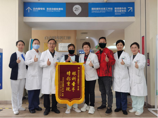 术后蔡阿姨和家人感激不已,为司马晶教授和医护团队送上了锦旗。出院当天,虽然蔡阿姨角膜还有些水肿,但视力已从眼前指数恢复至0.1,待恢复一段时间,眼部水肿消退,散光矫正,视力还应会有进一步提升。