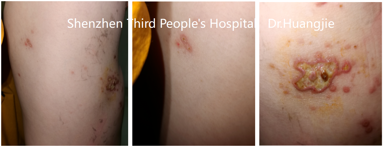 上述带状疱疹是不同时间就诊的,年纪也不同,表现也是各不相同,发生的部位也不一定相同,可以说带状疱疹可以部位“从头到脚”发生,如上述的头前额部、手部、大腿等等,但一般会有一个共同的特点,就是疼痛及密集的水泡往往在身体的一侧,很少发生在身体的两侧,当然特殊情况例外。