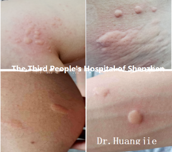 临床症状为风团、红斑或血管性水肿,发作形式多样,风团的大小和形态不一,多伴有瘙痒。数分钟至数小时内水肿减轻,风团变为红斑并逐渐小时,不留痕迹,但新风团可以此起彼伏,不断发生。病情严重的急性荨麻疹还可伴有发热、恶心、呕吐、腹痛、腹泻、胸闷及喉梗阻等全身症状。