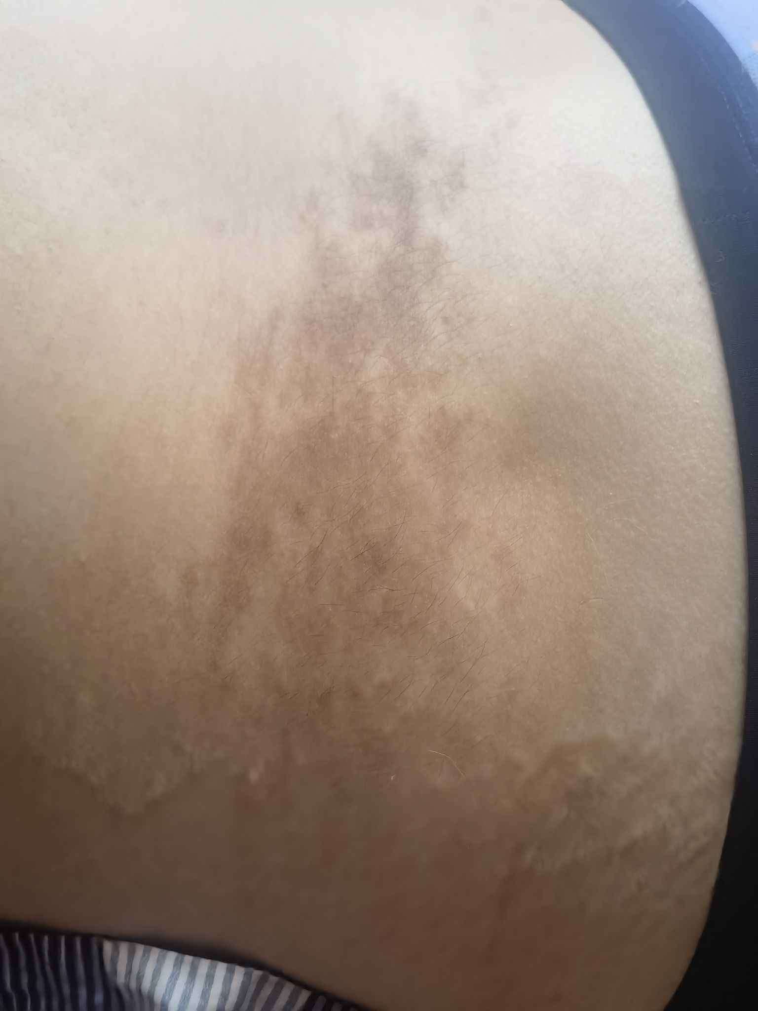 指导意见:根据上述描述及照片,这种情况是贝克氏痣(Becker 痣),不是黑色素瘤,一般也不痛不痒的。临床上,典型皮损表现为浅褐色至深褐色色素沉着斑片其边界清楚但形状不规则的,其中多半有增粗的毛发如同上述描述的“毛发浓郁”。表面可见毛囊性丘疹,系立毛肌增生所致,为Becker痣特征性表现。详细可以参考笔者文章《你了解Becker 痣(贝克氏痣)吗》,当然,也有仅有色斑但没有毛发增粗的情况,笔者也写了一篇短文《无毛发或少毛发Becker 痣(贝克氏痣)》