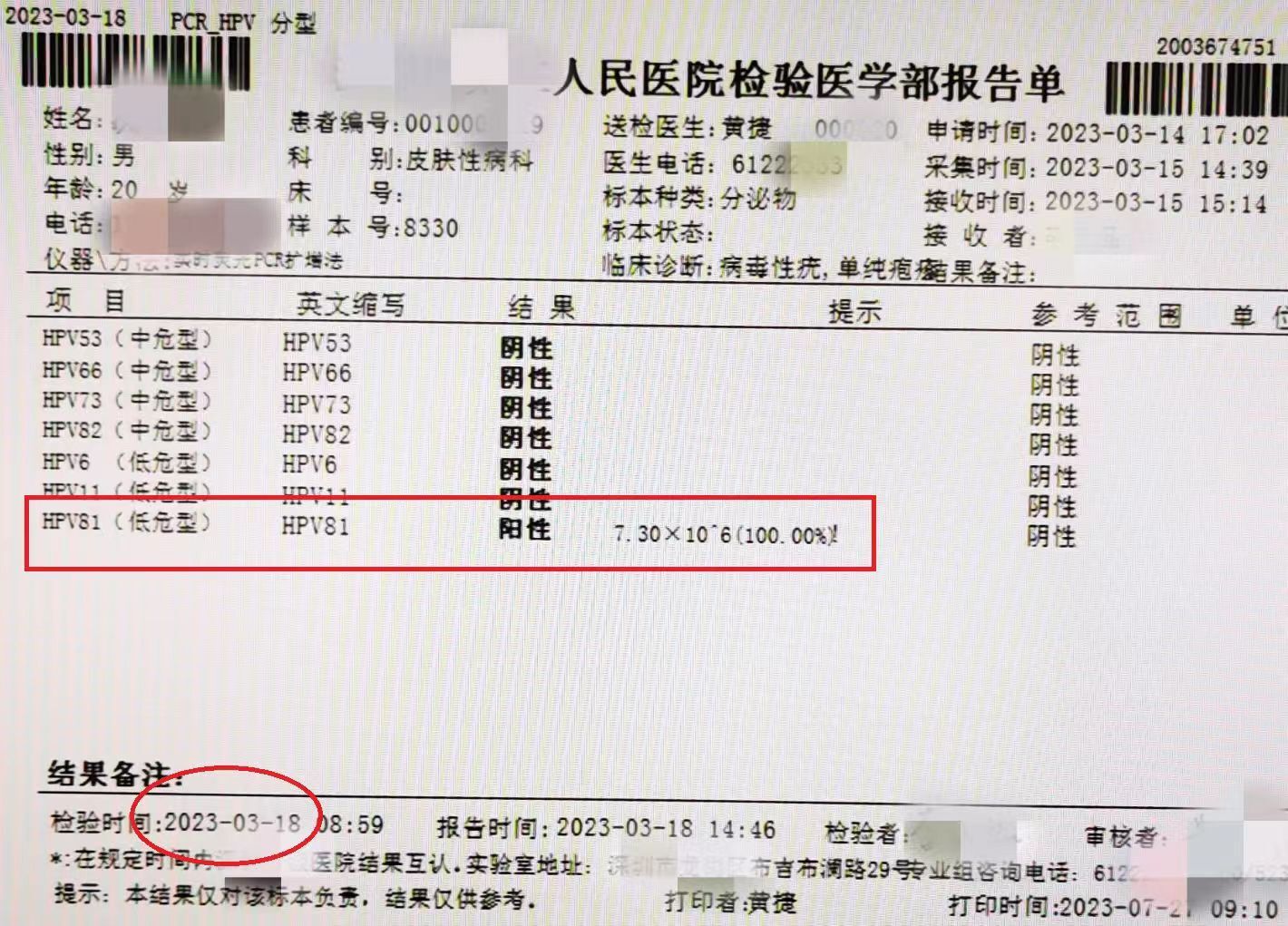 大家可以看看其今年2月份、3月份、7月份对外生殖器检查的HPV分型及病毒载量的检测,可以看出,从2-7月病毒的载量是逐渐升高的。