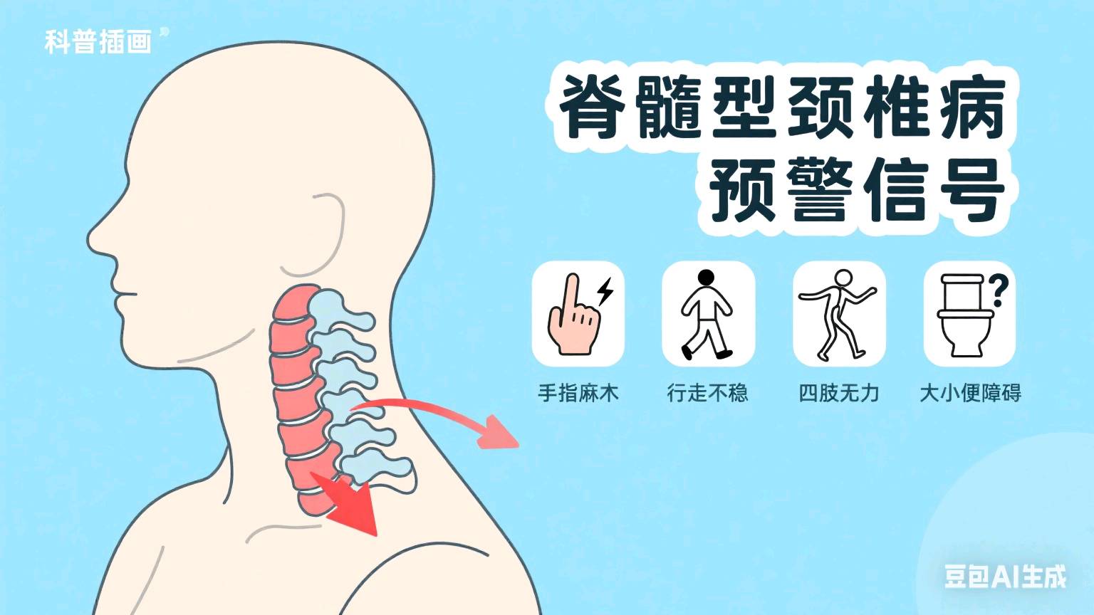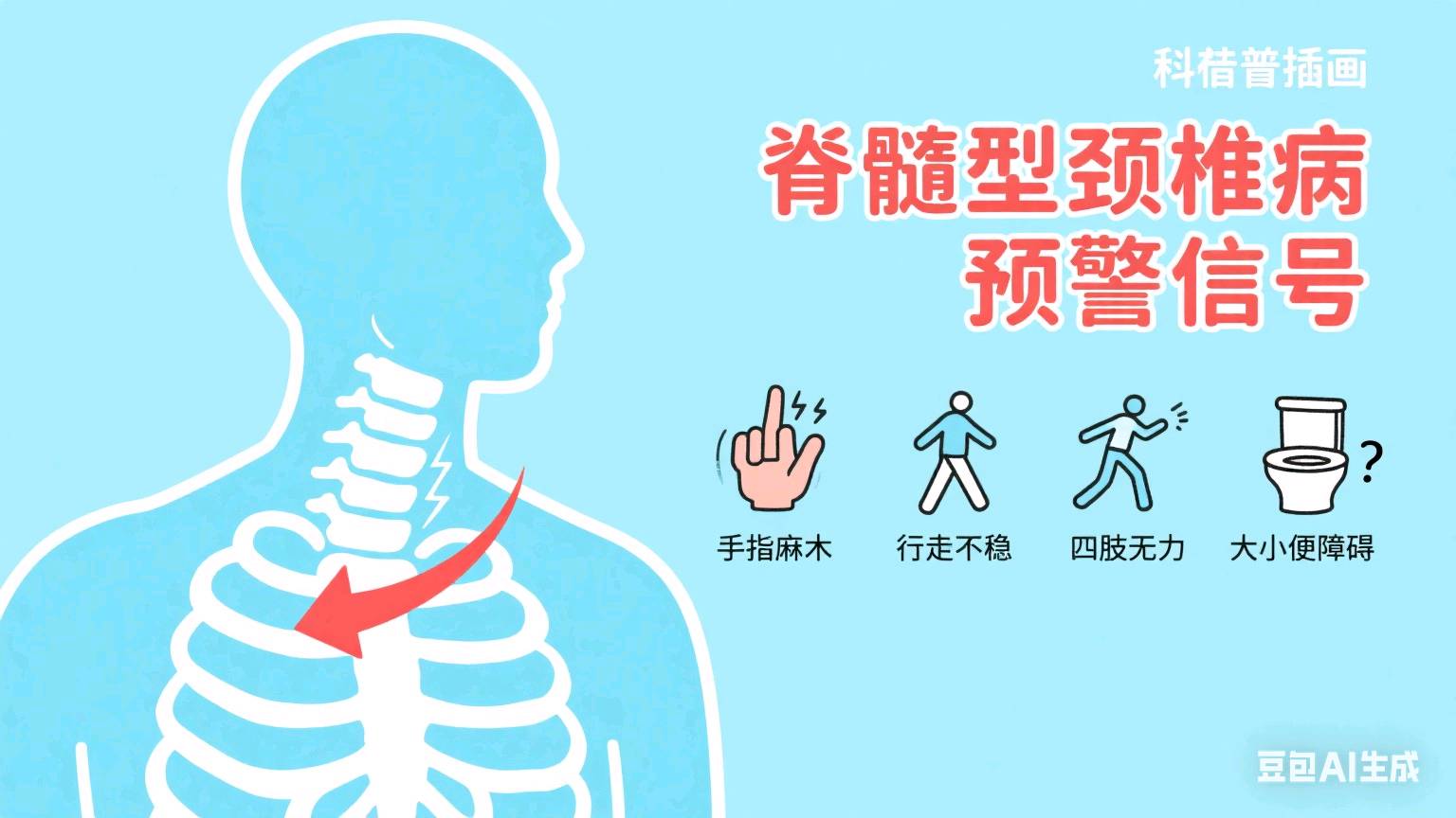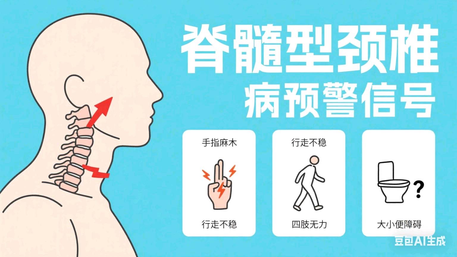 “脖子疼忍忍就好?小心!有一种颈椎病比‘落枕’危险10倍——脊髓型颈椎病,它悄悄压迫你的脊髓,严重时可能导致瘫痪!别等手脚不听使唤才重视,这4个信号一出现,立刻对照自查!”