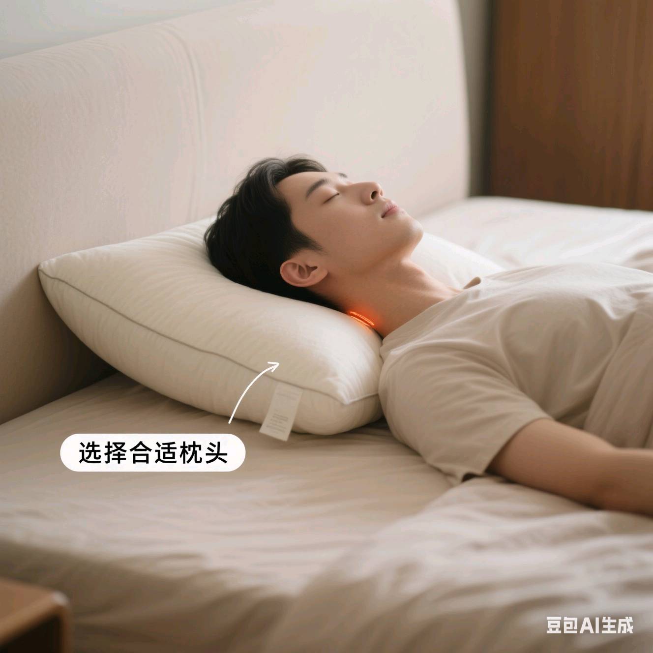 选择合适枕头:枕头高度以支撑颈椎生理曲度为宜(侧卧时颈部与床面平行)。