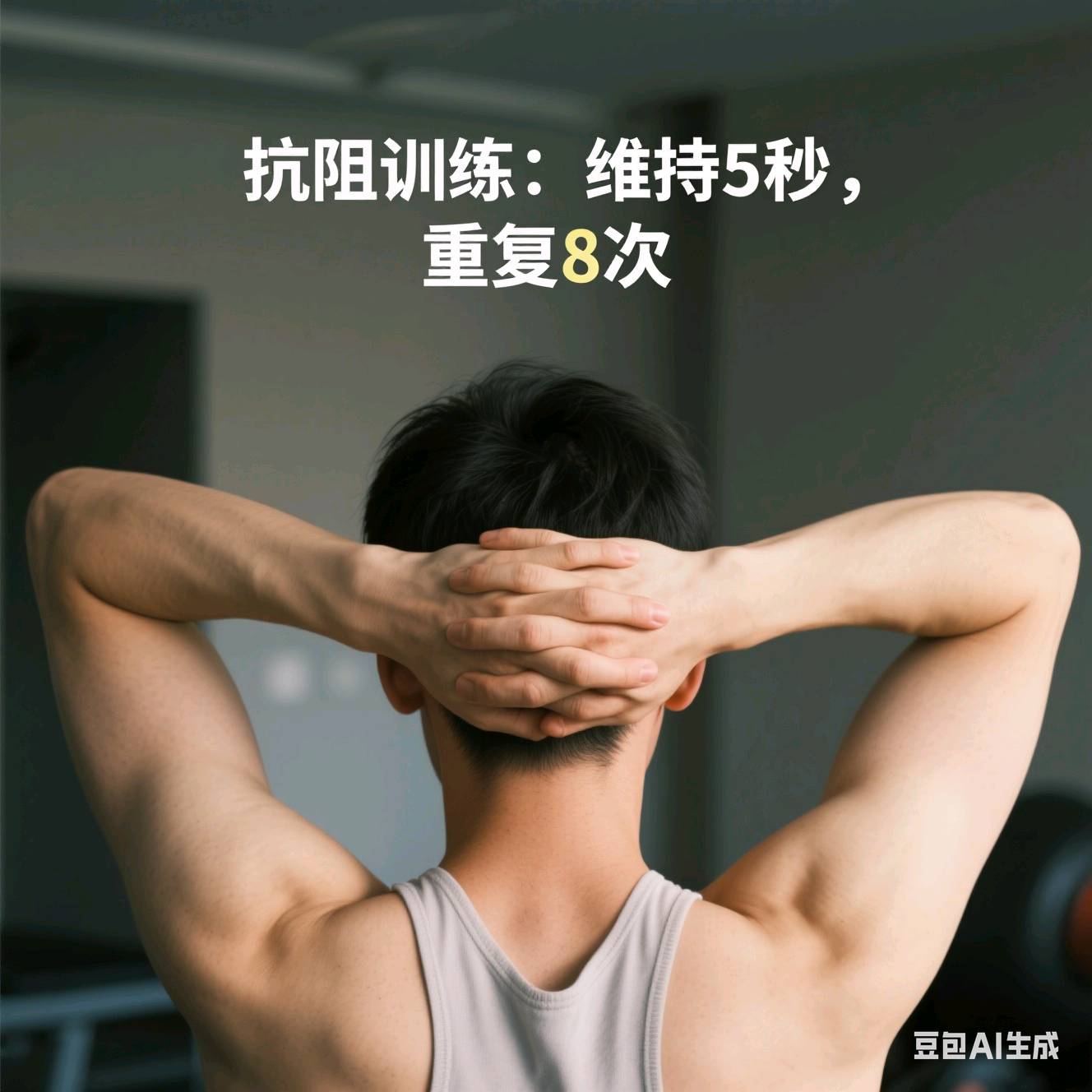 抗阻训练:双手交叉放于后脑勺,头部向后与手部轻微对抗,维持5秒,重复8次。