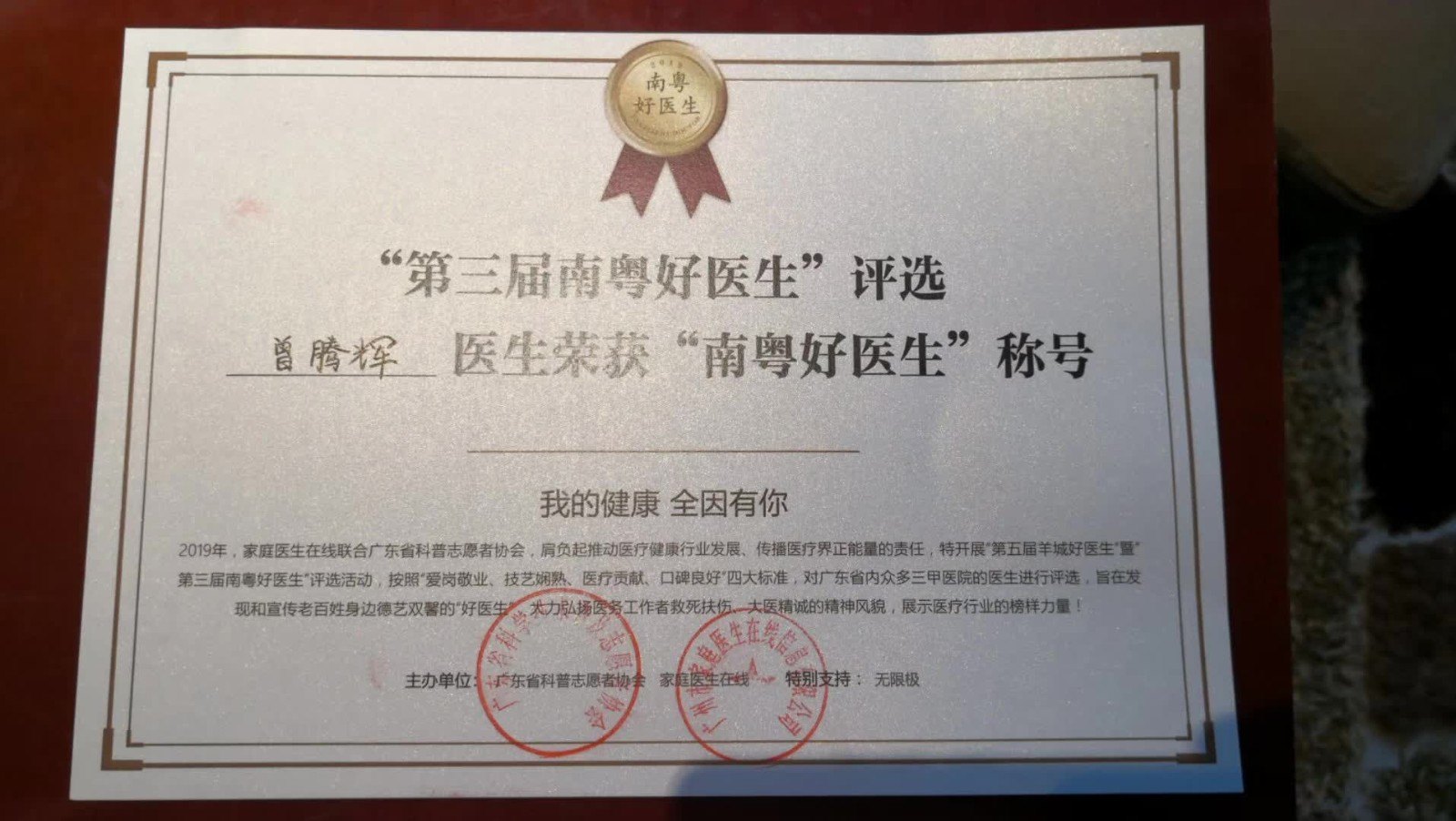 此次南粤好医生评选活动以“我的健康,全因有你”为主题,用科学客观的算法,配以全面细致的评审标准,从爱岗敬业、医疗贡献、技艺娴熟、口碑良好等多个维度评选出优秀的“好医生”。南粤好医生评选活动从广州到整个南粤大地,从“羊城好医生”、“羊城名医”到“南粤好医生”,列入评选的三甲医院越来越多,其中“羊城名医”包括钟南山院士、侯凡凡院士、宋尔卫院士、禤国维国医大师、周岱翰国医大师等医学大咖。能够有幸获得如此殊荣,向这些医学泰斗学习。也祝南粤医疗事业越来越进步,越来越好!