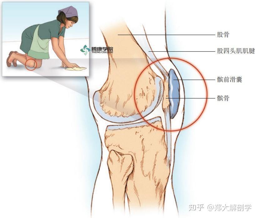 髌前滑囊位于髌骨和覆盖于髌骨下1/2的皮肤之间,延伸至髌下韧带的上部。髌前滑囊炎最常由创伤引起,特别是反复性跪地,从而使滑囊受到摩擦(女仆膝),但也能由感染和结晶体所致如痛风。