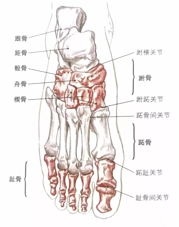 依解剖结构由远端到近端的顺序分为趾骨间关节、跖趾关节、跖骨间关节、跗跖关节、跗横关节。