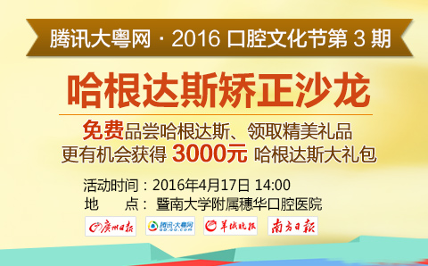 你是否还在忍受着“龅牙妹”、“龅牙哥”、“牙擦苏”的人生?你是否因为畸形牙问题而被心仪企业拒之门外?你是否因为畸形牙问题而与美好爱情擦肩而过?校正失败人生,从矫正牙齿开始,为了让更多人绽放自信迷人笑容,让人生不留遗憾,腾讯大粤网将携手暨南大学附属穗华口腔医院于4月17日举办2016 口腔文化节第 3 期之哈根达斯矫正沙龙。