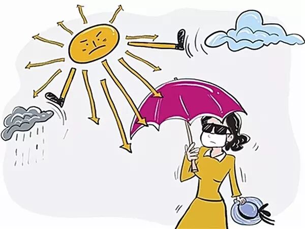 (2)烈日曝晒,可戴上宽边浅色遮阳帽,打遮阳伞。